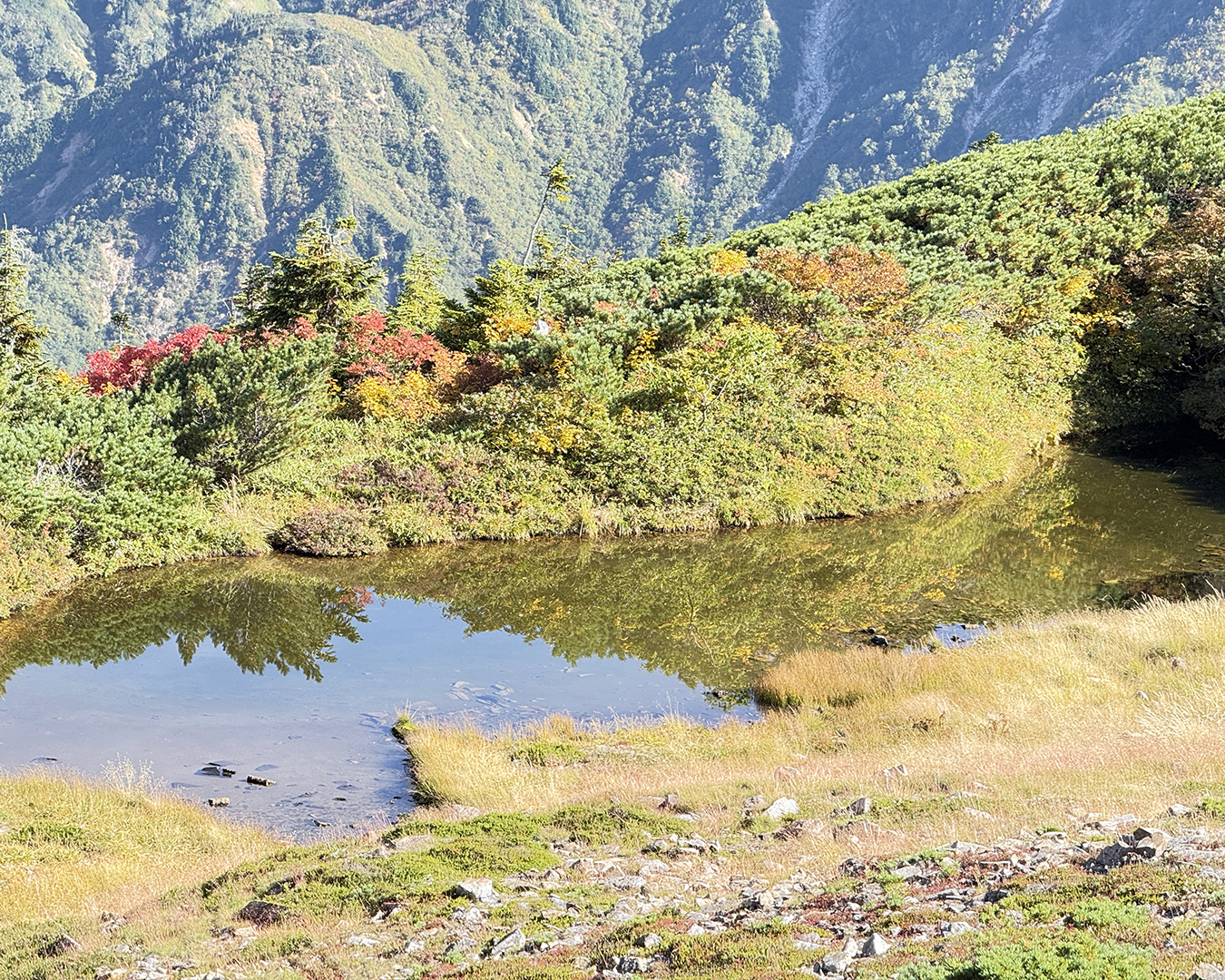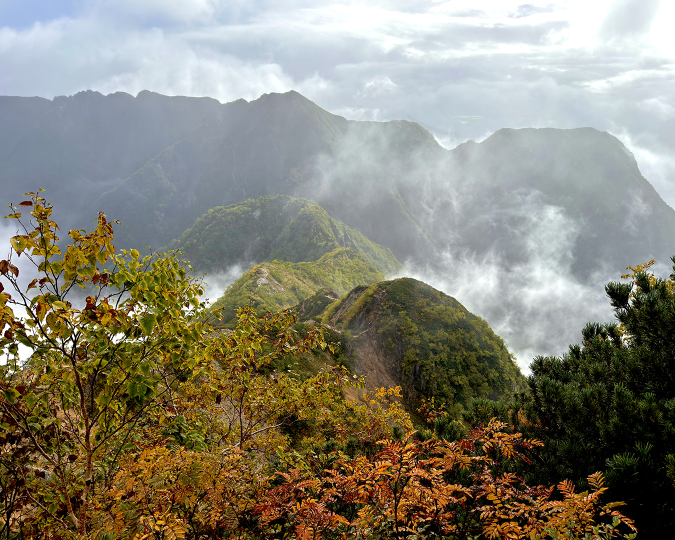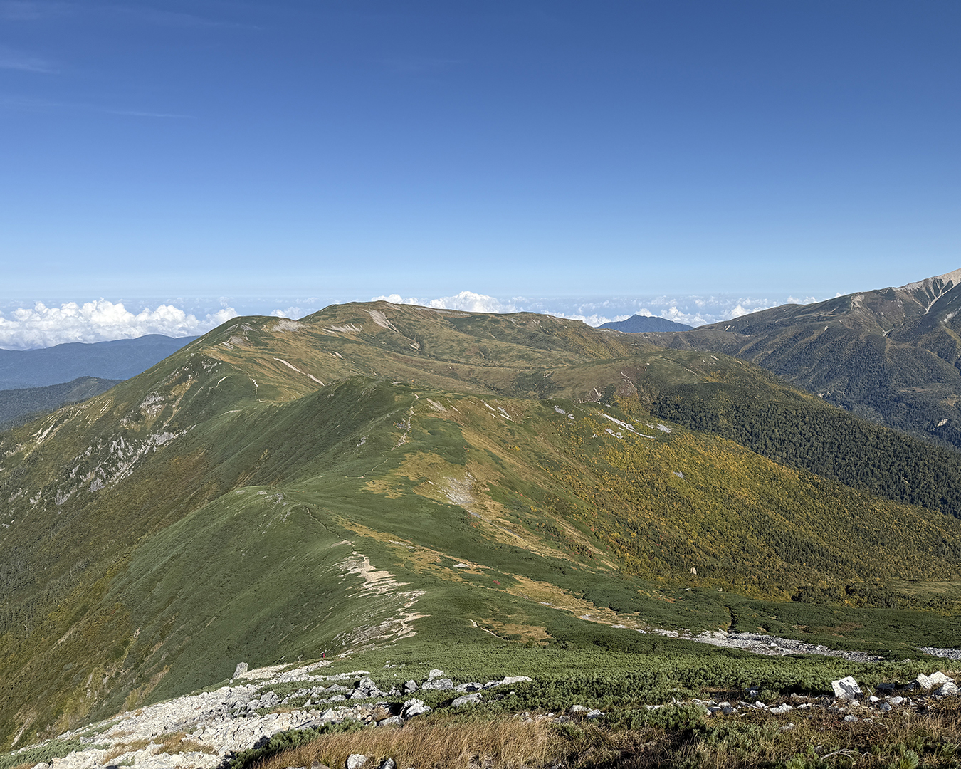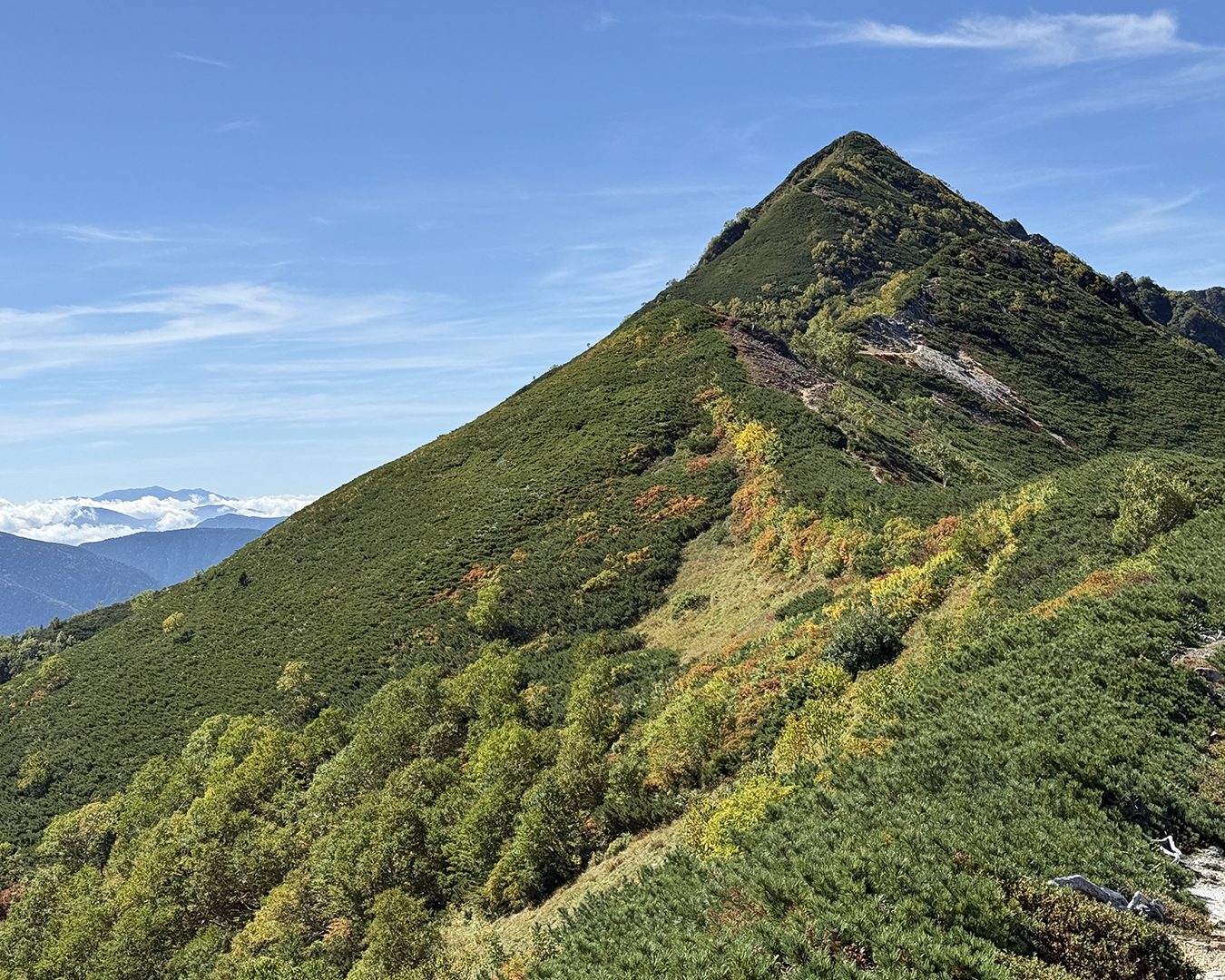 この日はなかなかアップダウンが多い1日だった。薬師岳まで登ると、そこからは苦手な岩場が続く。とはいえ、少しずつ岩場にも慣れてきており、常念岳の時のように焦ることもない。確実に成長している自分を感じる。北薬師岳を越える頃には、見事な紅葉が広がり、その美しさに思わず足が止まった。
