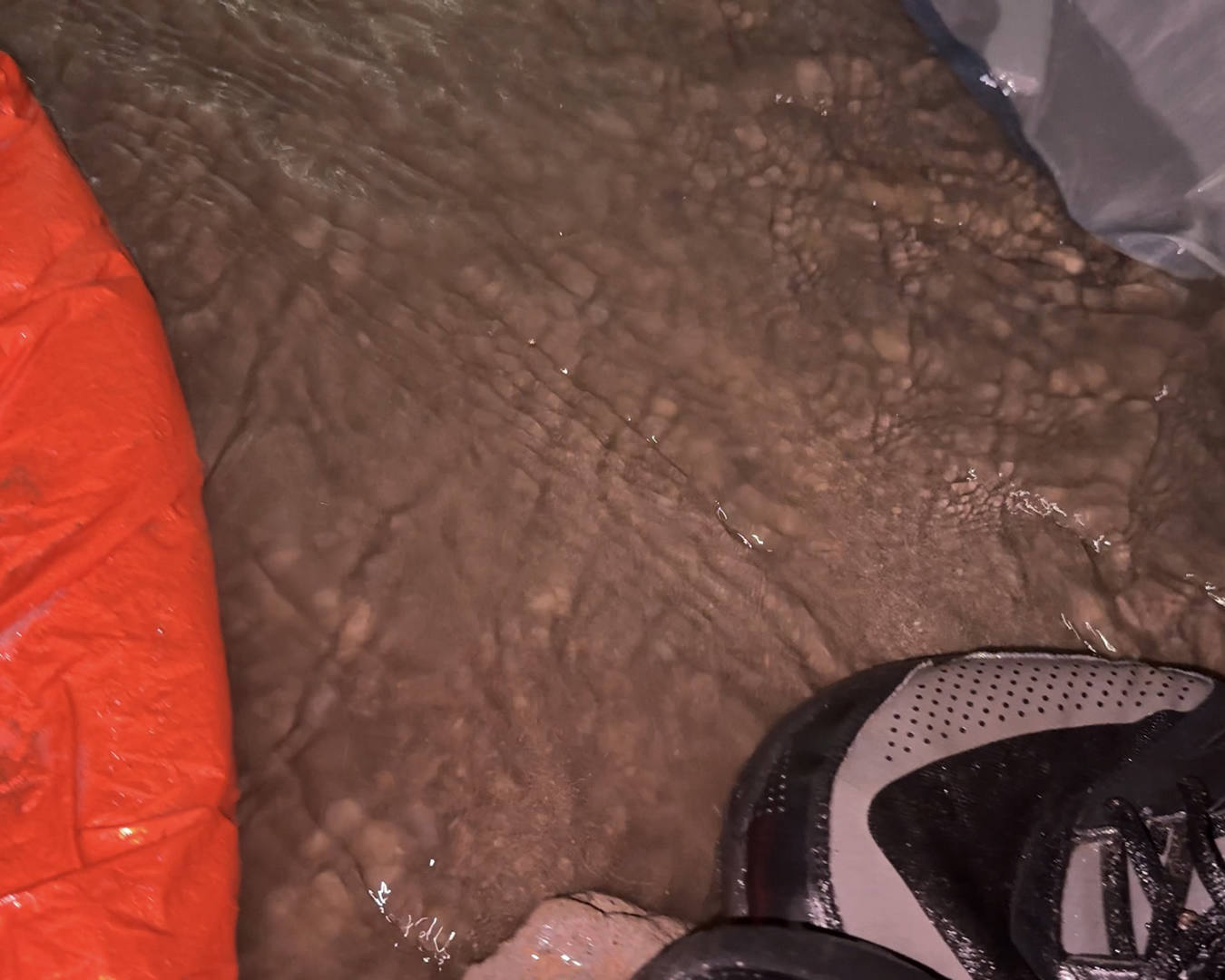 そして早朝5時。目を覚ますと、なんと自分は川の上で寝ていた。フロアレスのシェルター内が雨で浸水していたのだ。「なんだこの状況は」と一瞬戸惑うも、ここまでくると逆に笑えてくる。濡らしたくないウェアや道具をパックライナーや防水スタッフサックに入れておいたおかげで、大事な装備は無事だった。
