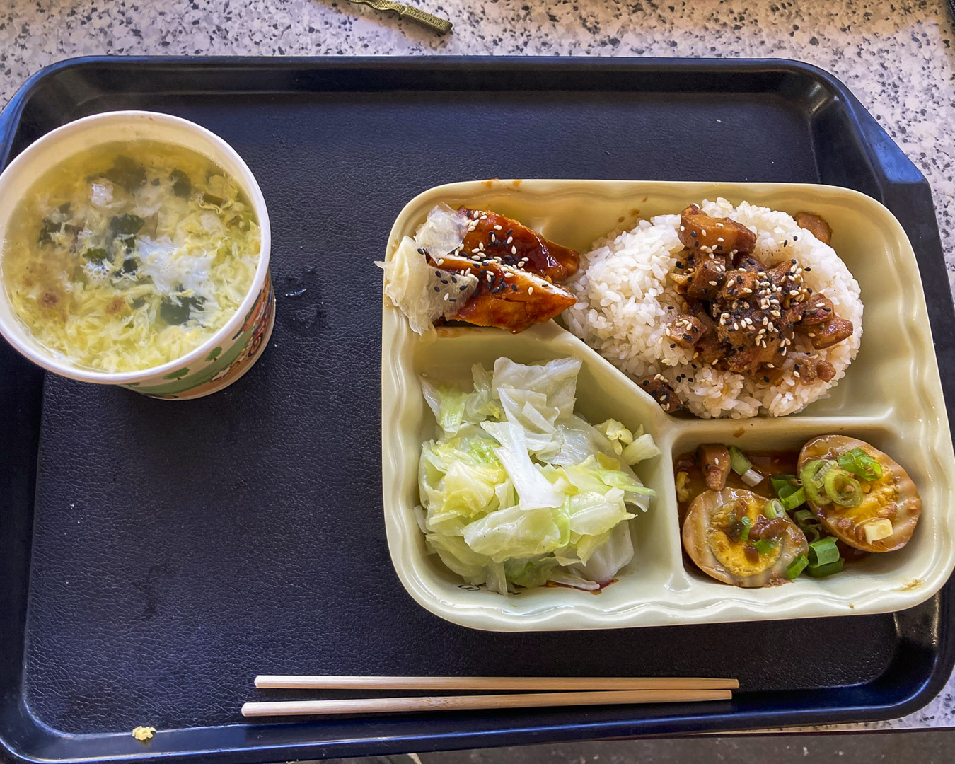ちょうど、昼時に村を通りかかったので、食堂に入ることにしました。通り沿いの店に入ると、優しそうな女店主がメニューを持ってきてくれます。メニューに記載されている「便當」の文字を指して「これはなんですか?」と質問すると、「セットメニューのお弁当よ。いろいろなおかずが食べられるわよ」と教えてくれます。ぼくは、「おお、定食ってことかな? こんないいものがあったのか!」と喜んで、こちらを頼むことにしました。