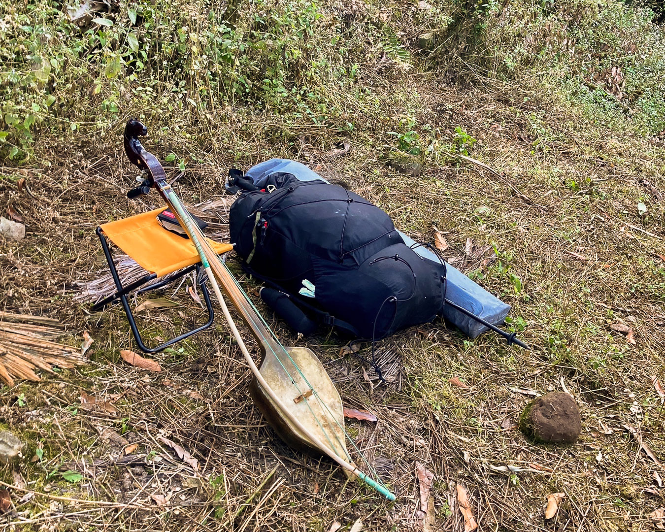森の中での気持ち良い目覚め。テントを畳んでパッキングを済ませたところで、誰も気にせず大きな声を出せそうな気持ちの良い山の中だったので、せっかくだからと、折りたたみ椅子を広げて腰掛け、馬頭琴を弾き、大きな声で歌いました。バスキングができたらいいなと思って道中に手に入れたこの椅子も、結局、活躍の場がないままだったしね。しかし、椅子はやはり重いので、手放そうかと考え中…。はあ、久々に、朝一番に大声を出して歌えて、気持ち良かったです。