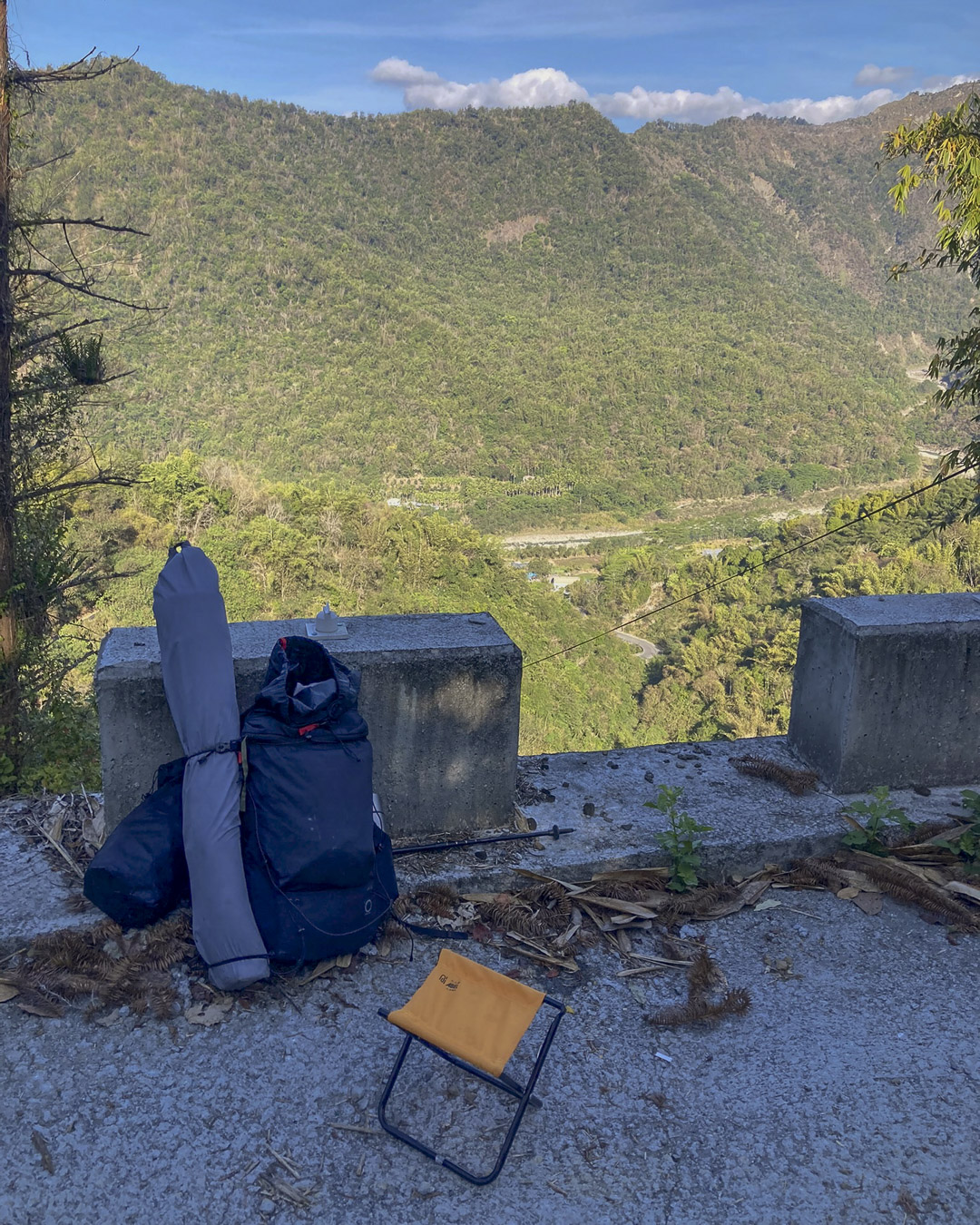 この日の残りの道はアップダウンの激しい行程でした。山からの見晴らしの良いポイントにて、手放そうかと思いながらもずっと担いで歩いている椅子に座って休憩。
