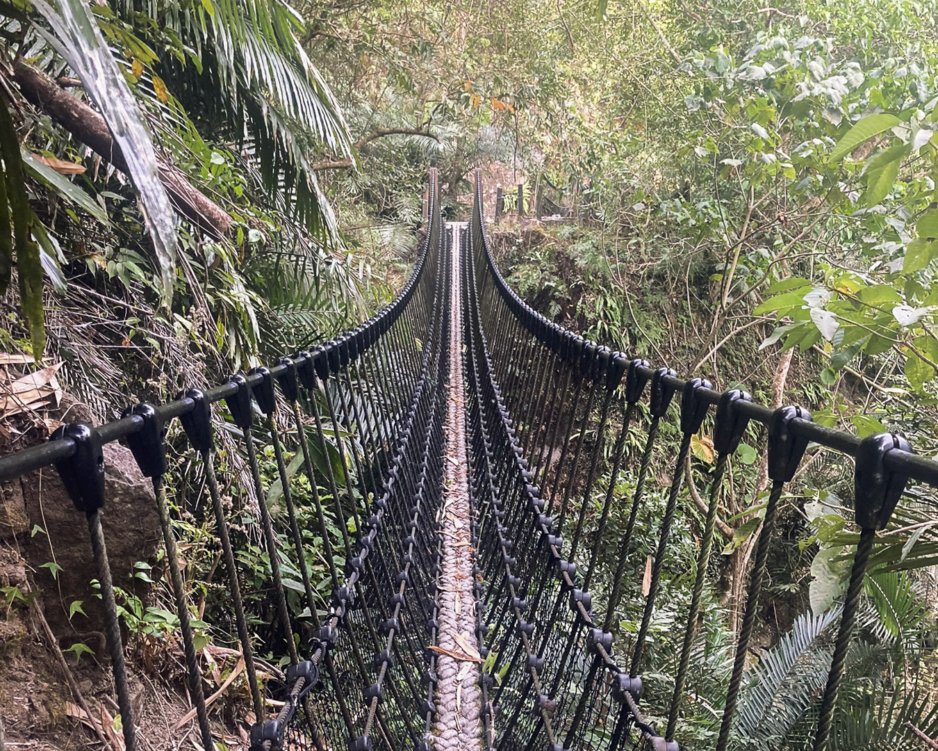 教えてもらった吊り橋までは、いろいろな建物や売店があって、まさにアミューズメントパークといった様子。吊り橋を渡ったところからは、山道となっていて、その先は吊り橋を何本も渡って歩きます。もう薄暗く、心配な気持ちもありながら、久々にコンクリートの車道から解放されて、土の上、木々の中を歩ける喜びを感じていました。