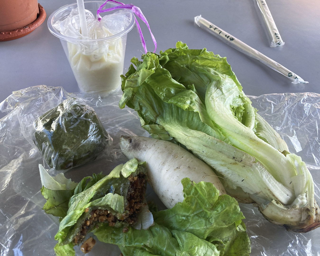 お饅頭をバックパックに担いでいたレタスを巻いて食べたらおいしかった。生野菜が嬉しい。