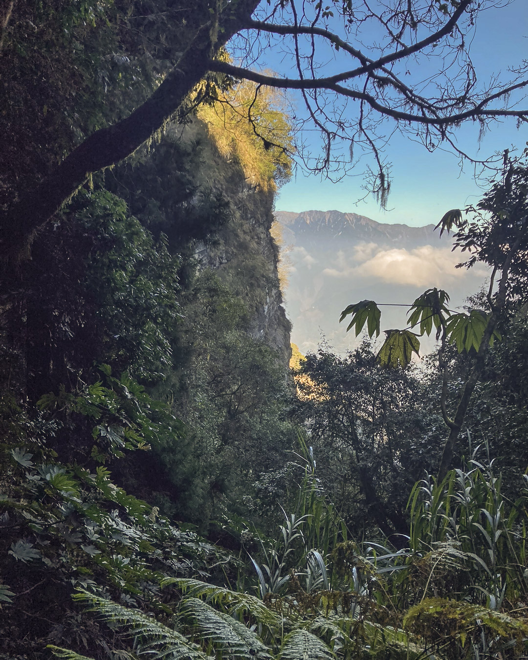 阿里山国立公園へと登ってきた山の逆斜面の急な谷を降っていきます。テントを張れそうな平地はどこにもなさそうだ…。