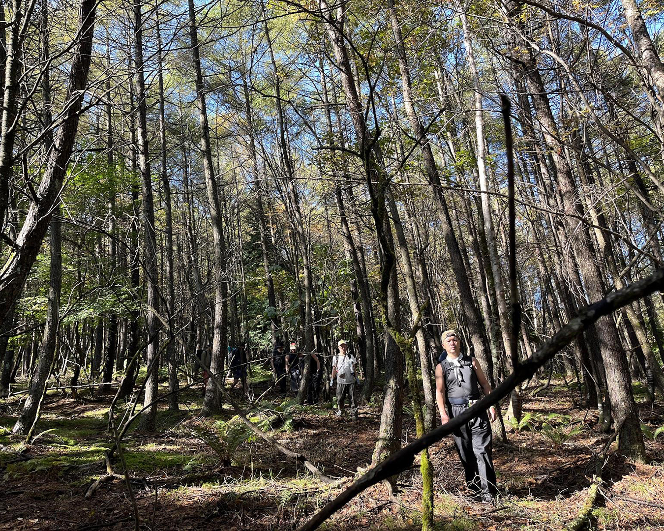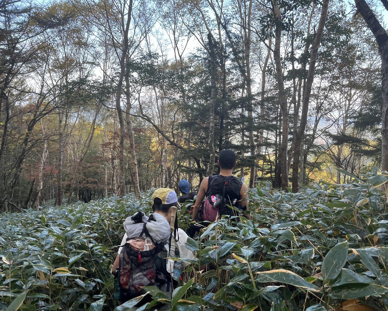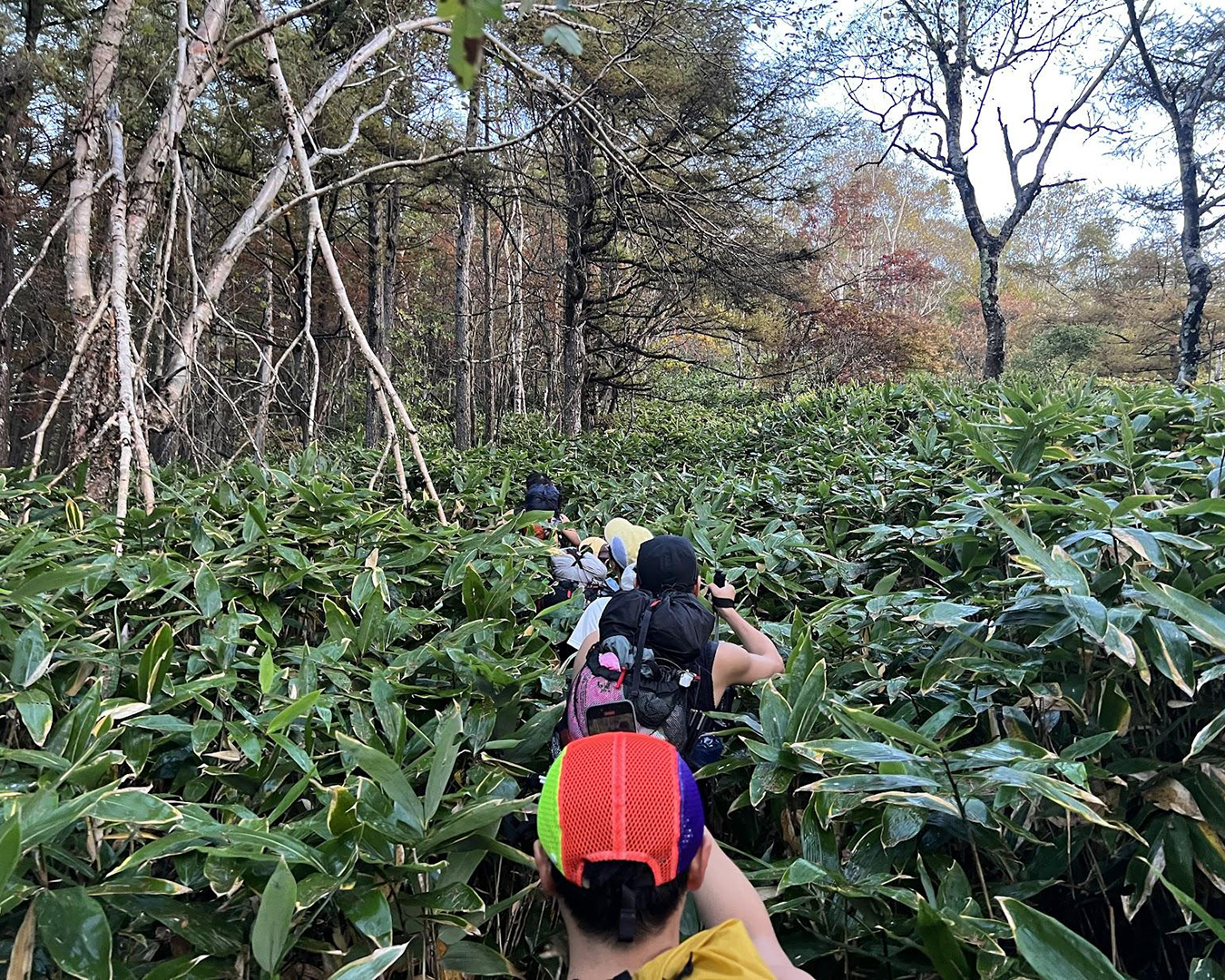 20分ほど進むと、藪漕ぎが始まった。ロードで子グマらしき鳴き声を聞いていたので、クマとの遭遇にビビりながら、みんなで声を上げ、ホイッスルを吹きながら濡れた藪をかき分けていく。