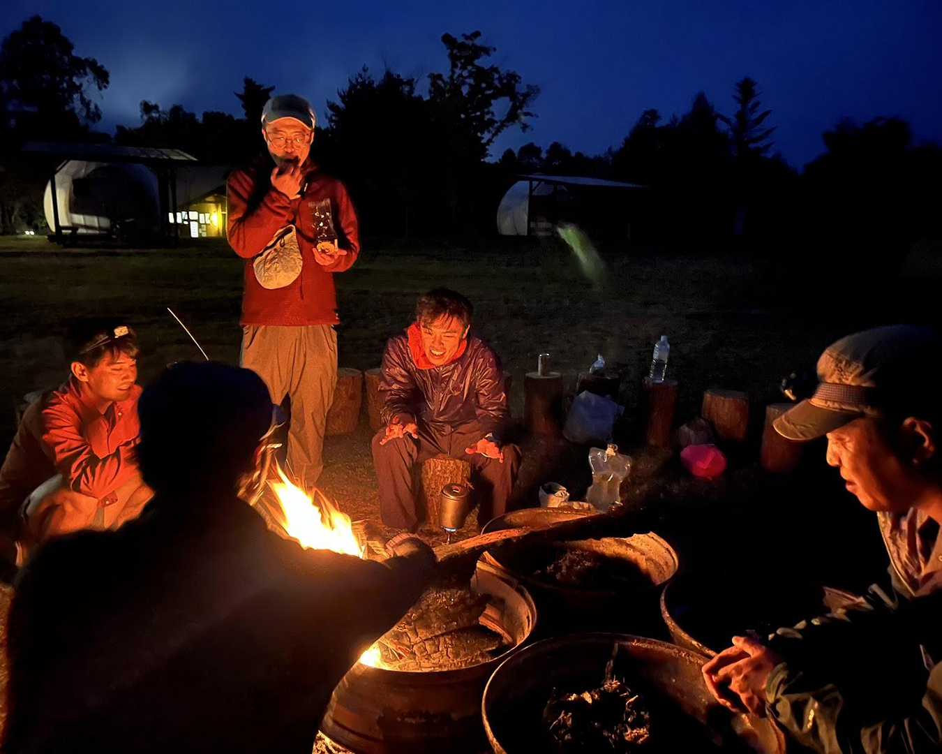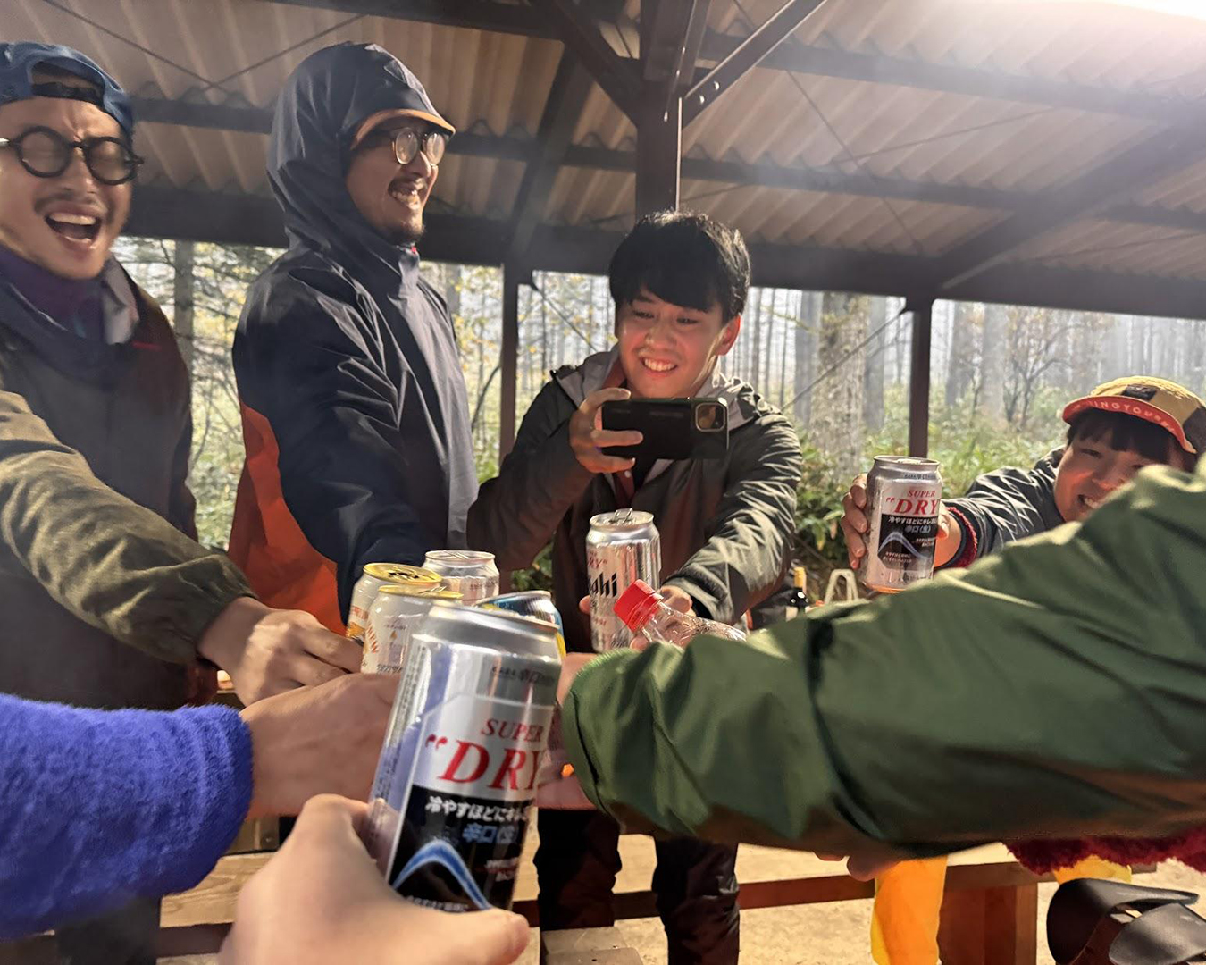 2時間弱歩き、無事にホテルに到着。お風呂でしっかり温まることができた! その後は、キャンプ場の竈で焚いた火を囲み、ビール片手にワイワイしながら明日以降へのエネルギーをチャージした。