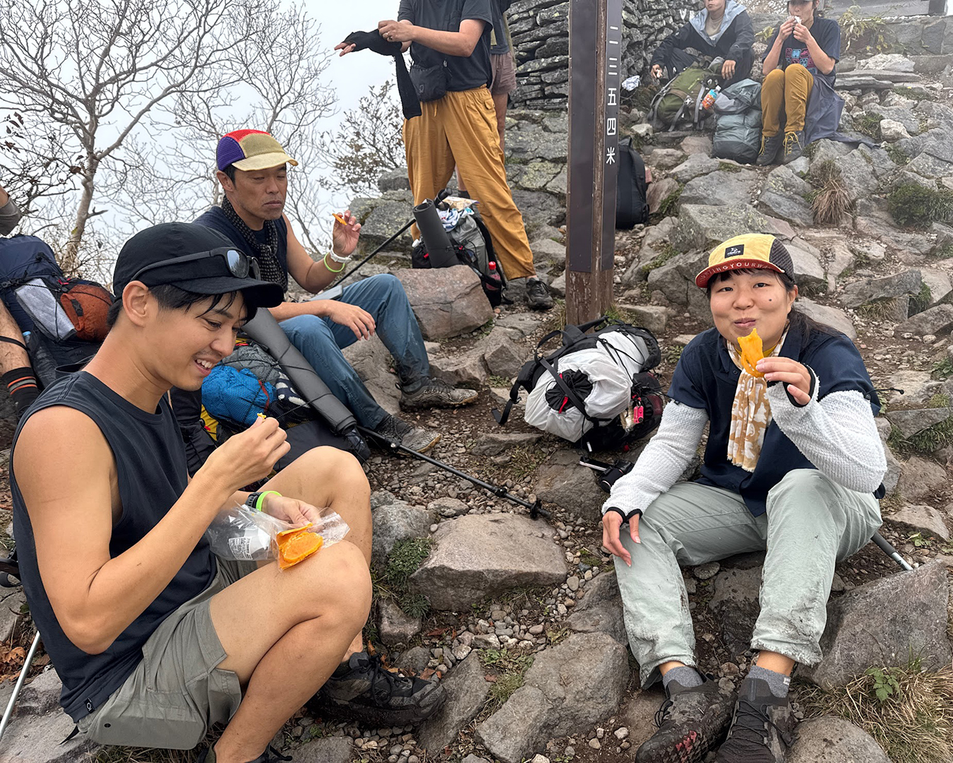 山頂でしばしの休憩。おだじーの出張土産、干し芋でエネルギー補給。