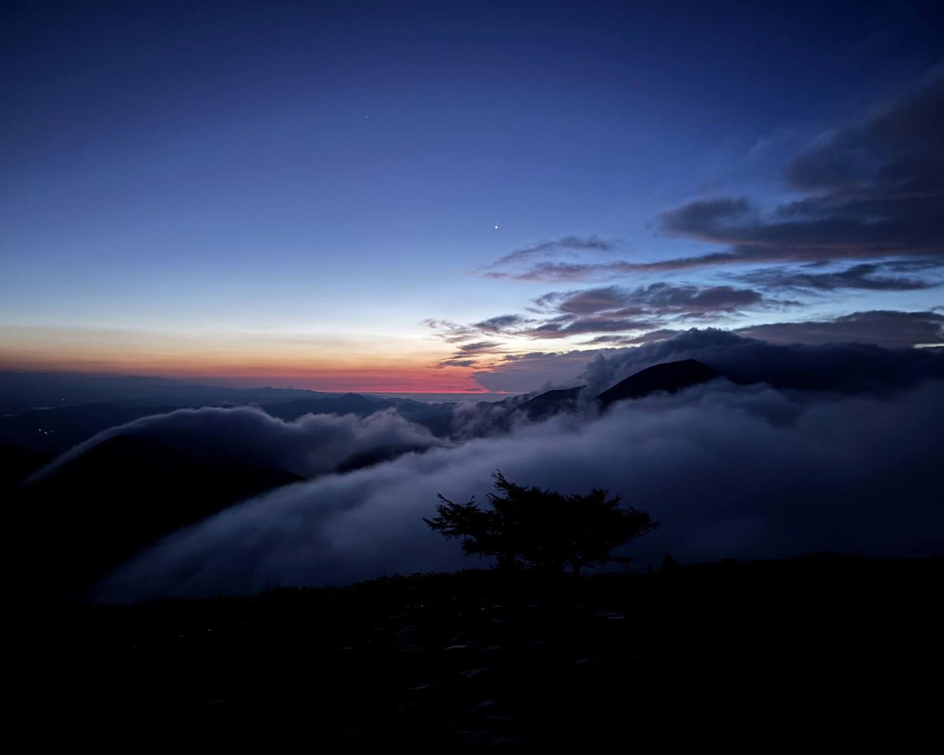 まず目指すは湯ノ丸山。キャンプ場から一気に800mほど高度を上げていく。夜明け前の湯ノ丸山からの景色は素晴らしく、3日目にして、雲にかかった前掛山、そして浅間山を拝むことができた。予想通り順調なスタート。