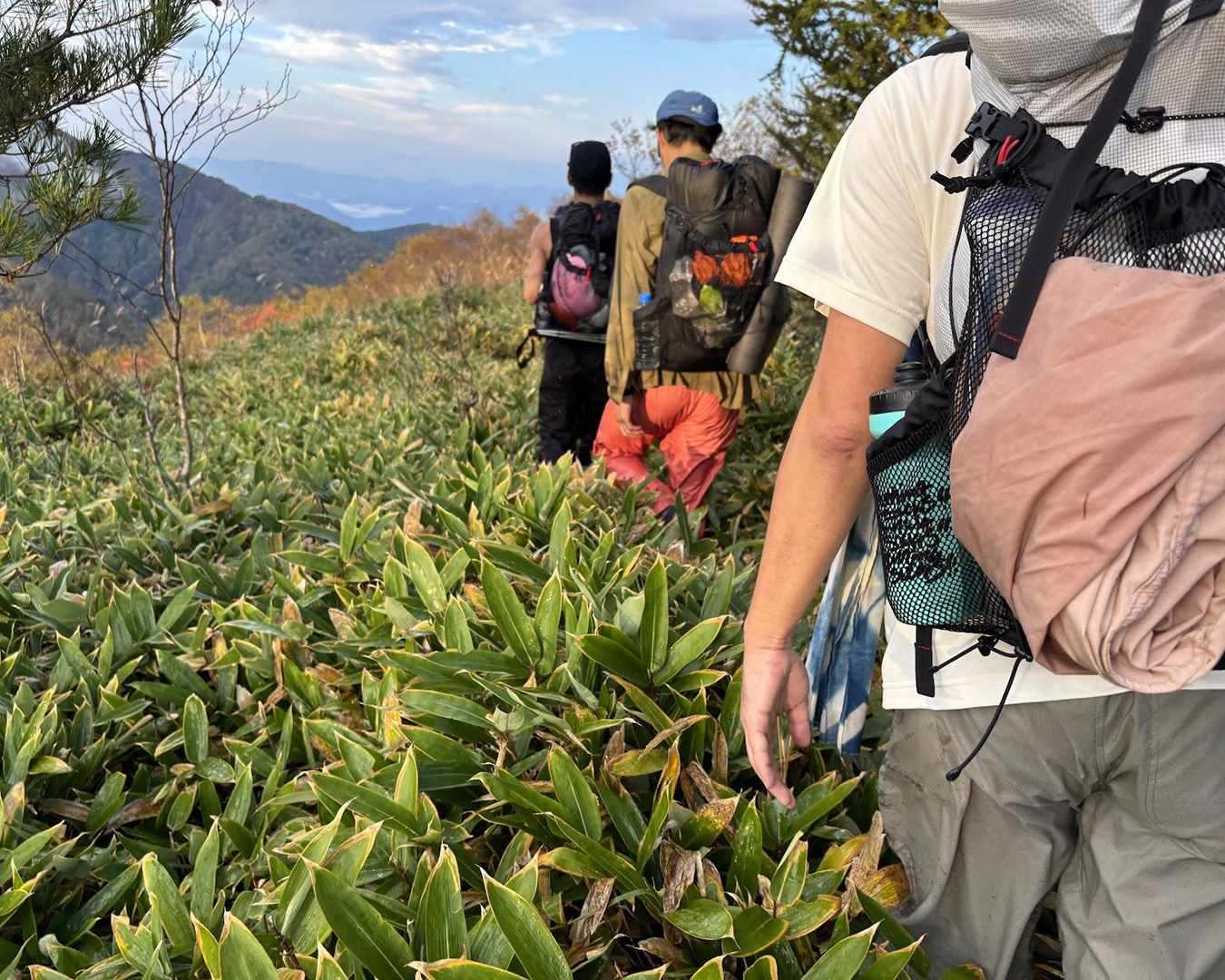 背丈ほどの藪を慎重に進んでいくが、あまりにルートが見えないようで、おーじさんが先頭を替わり、その後を自分が追う。クマザサの弾力性は強く、旅慣れたおーじさんも跳ね返されるのを見て、「これはやばいな」と少し緊張感が走る。