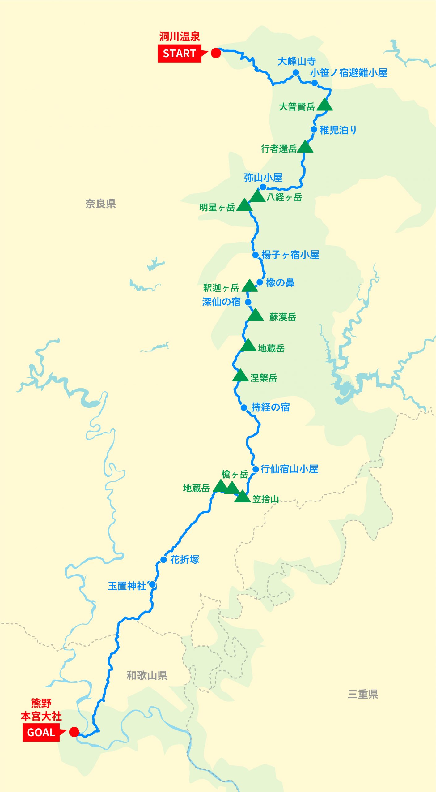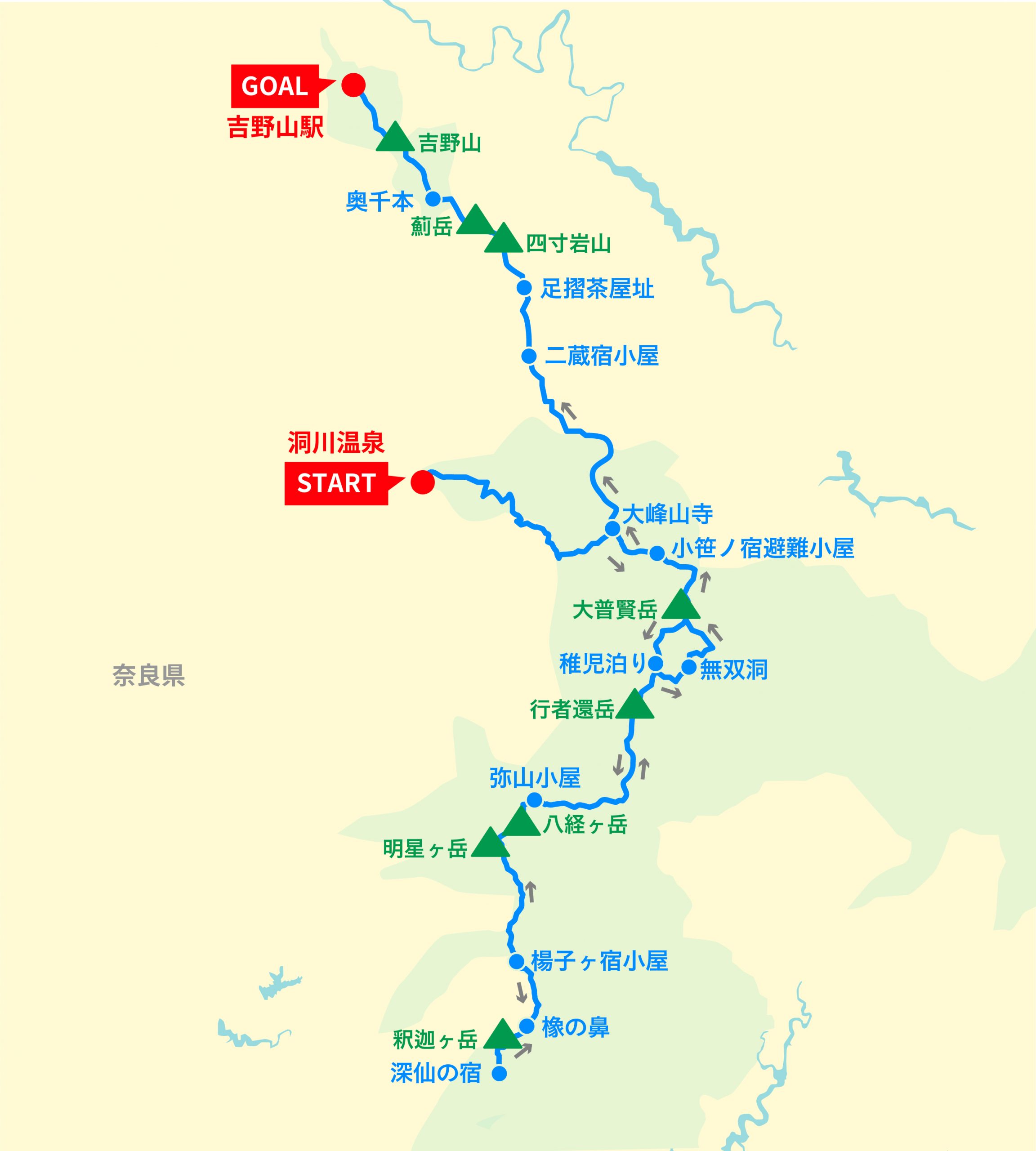 今回ルートとして選んだのは、大峯奥駈道セクションハイク。大峯奥駈道自体は、「吉野山(奈良県吉野町)」と「熊野本宮大社(和歌山県田辺市本宮町)」を結ぶ約100kmの道のりだが、確保できた日程と自分の体力ですべてを歩き切れるか未知だったので、洞川温泉からスタートして釈迦ヶ岳あたりでU字を描く様に北上して、吉野山でゴールすることにした。
