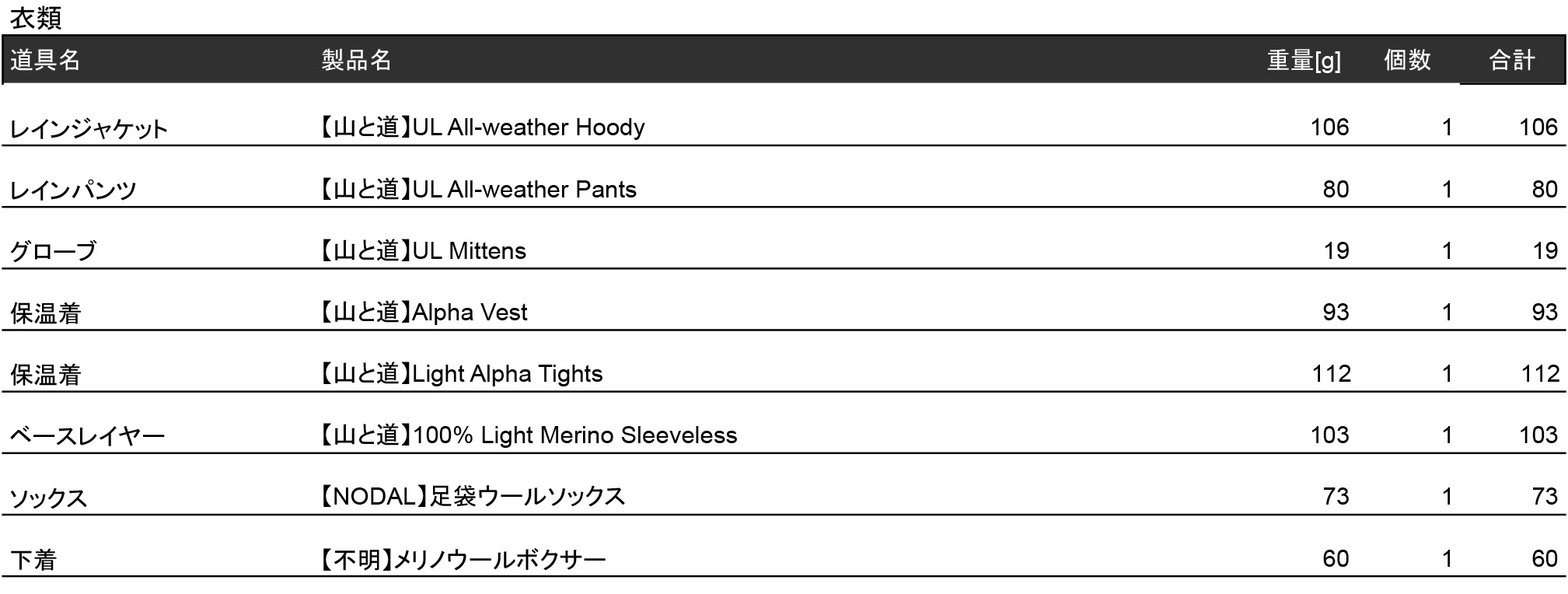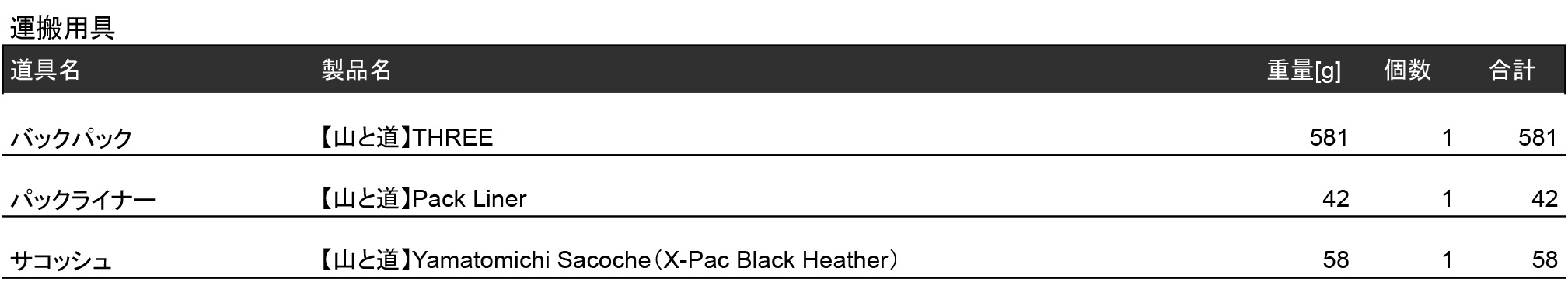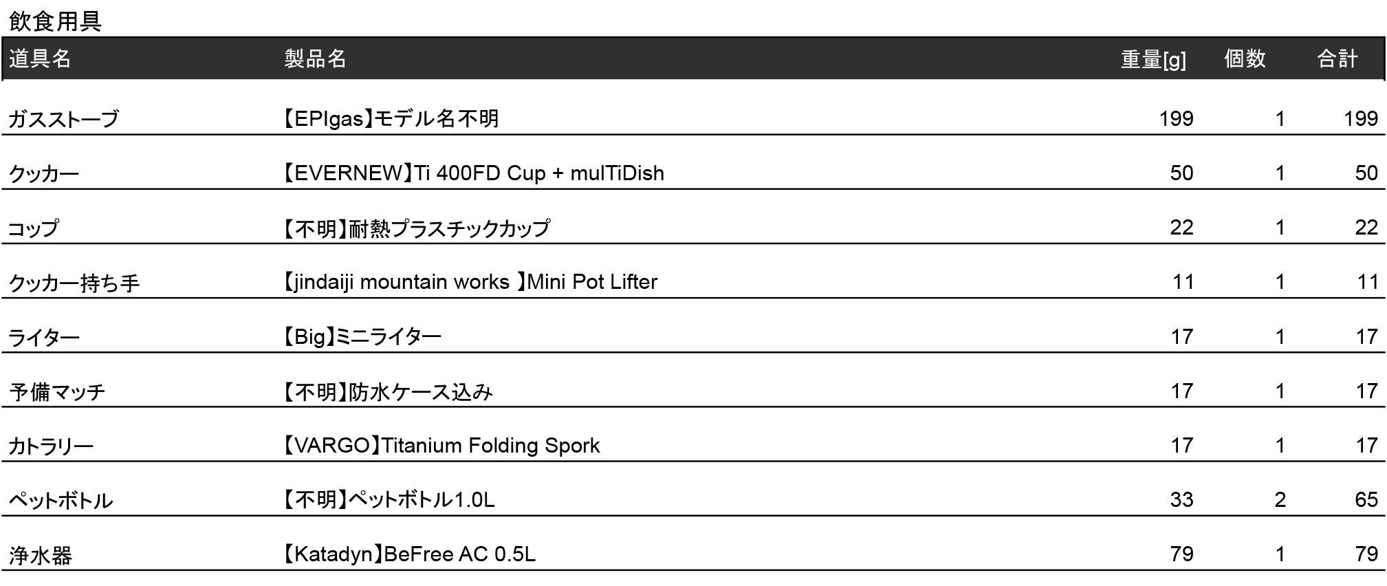 *水・食料・燃料以外の装備を詰めたバックパックの総重量