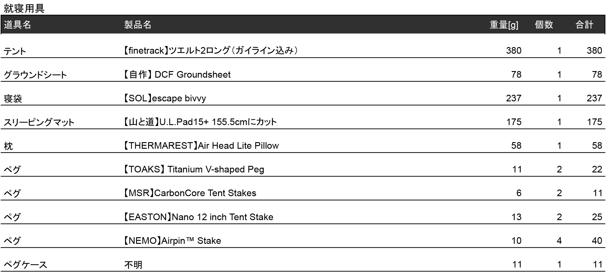 今回お供に選んだギアたち。改めて並べてみると、以前よりも随分軽量化、取捨選択が進んだなぁと思う。今の自分には吉と出るか凶と出るか。