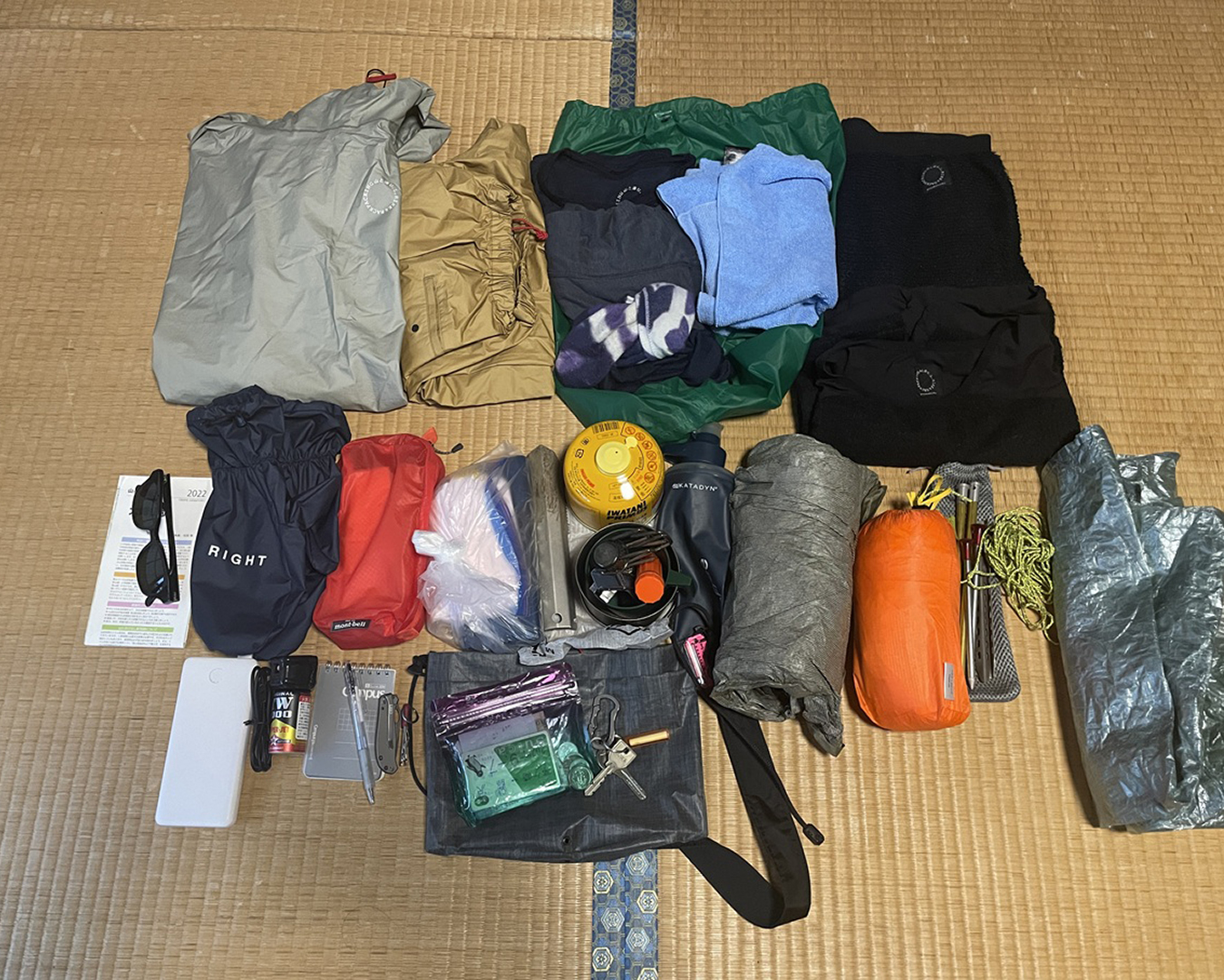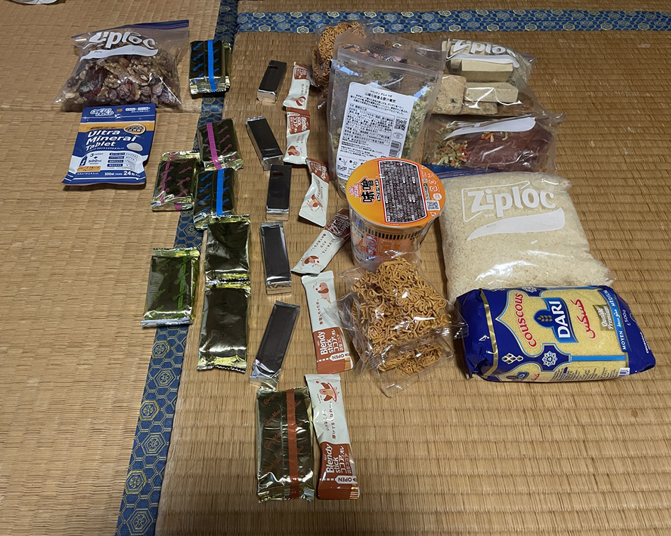 初めて食糧の計画を行ったが難しく、荷物の重量と行動時間からAIに計算してもらった1日の摂取カロリー推奨量6,000kcalを満たすほど多く食べられる気もしないので、なんとかなると覚悟を決めることにした。にも関わらず、多少の重量増があっても嗜好品を持ち込み、チルタイムを楽しむという従来の自分のスタイルを捨てきれない。持っていきたかったが断念した文庫本や酒、ウォークマン、イヤホンなどに未練を残しつつ、準備を進めていった。
