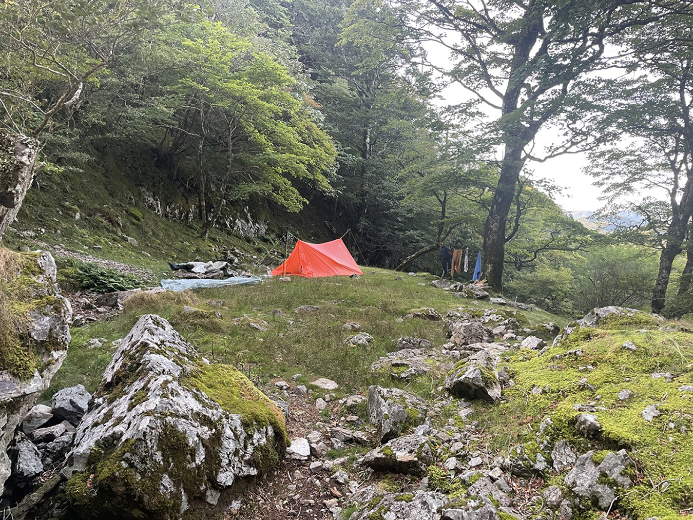 想定通り、七曜岳そばの“稚児泊り”まで進むことができたので、今日はここでテント泊としよう(編注:大峯奥駈道でのテント泊は、禁止エリア以外では原則禁止されていません。)先客の自立式テント2張を横目に、不慣れなツェルトにやや手間取りながらも寝床を作り終える。