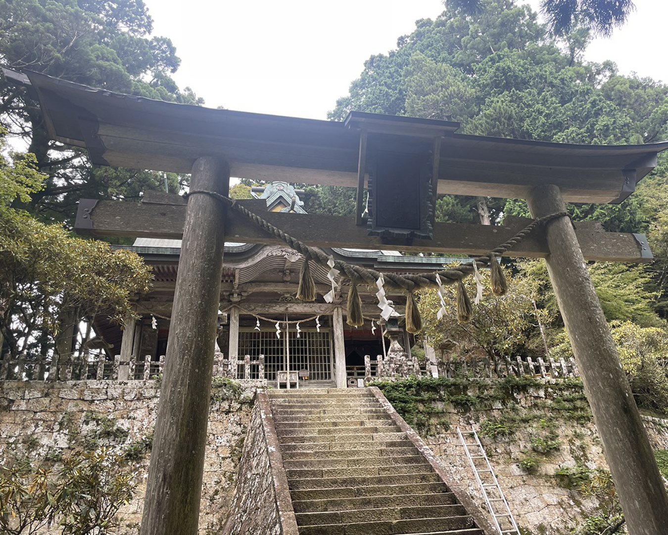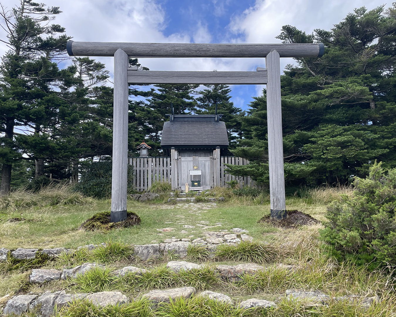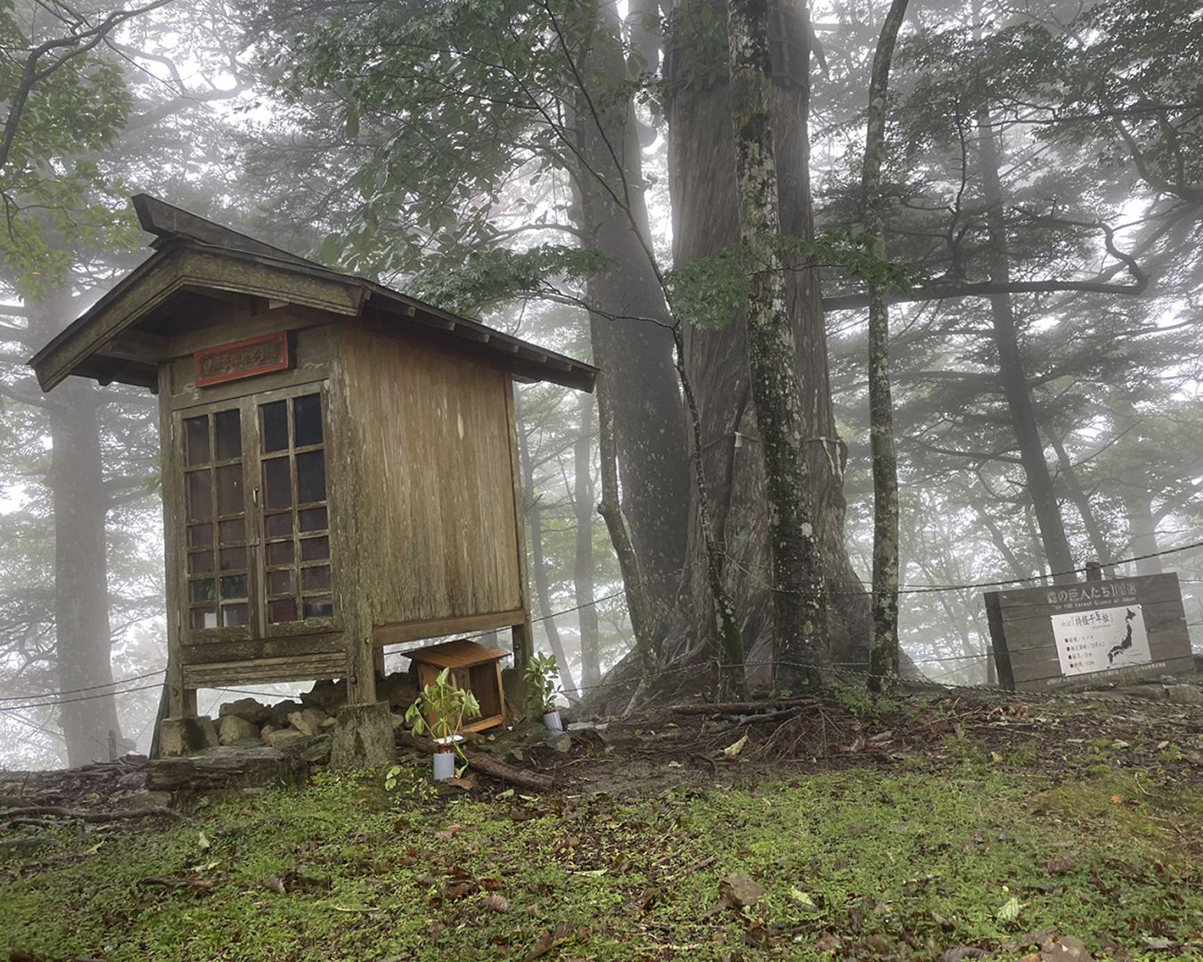 弥山頂上の弥山神社。旅の無事をお参りしたあと、微弱な電波が入り、日報報告を済ませた。