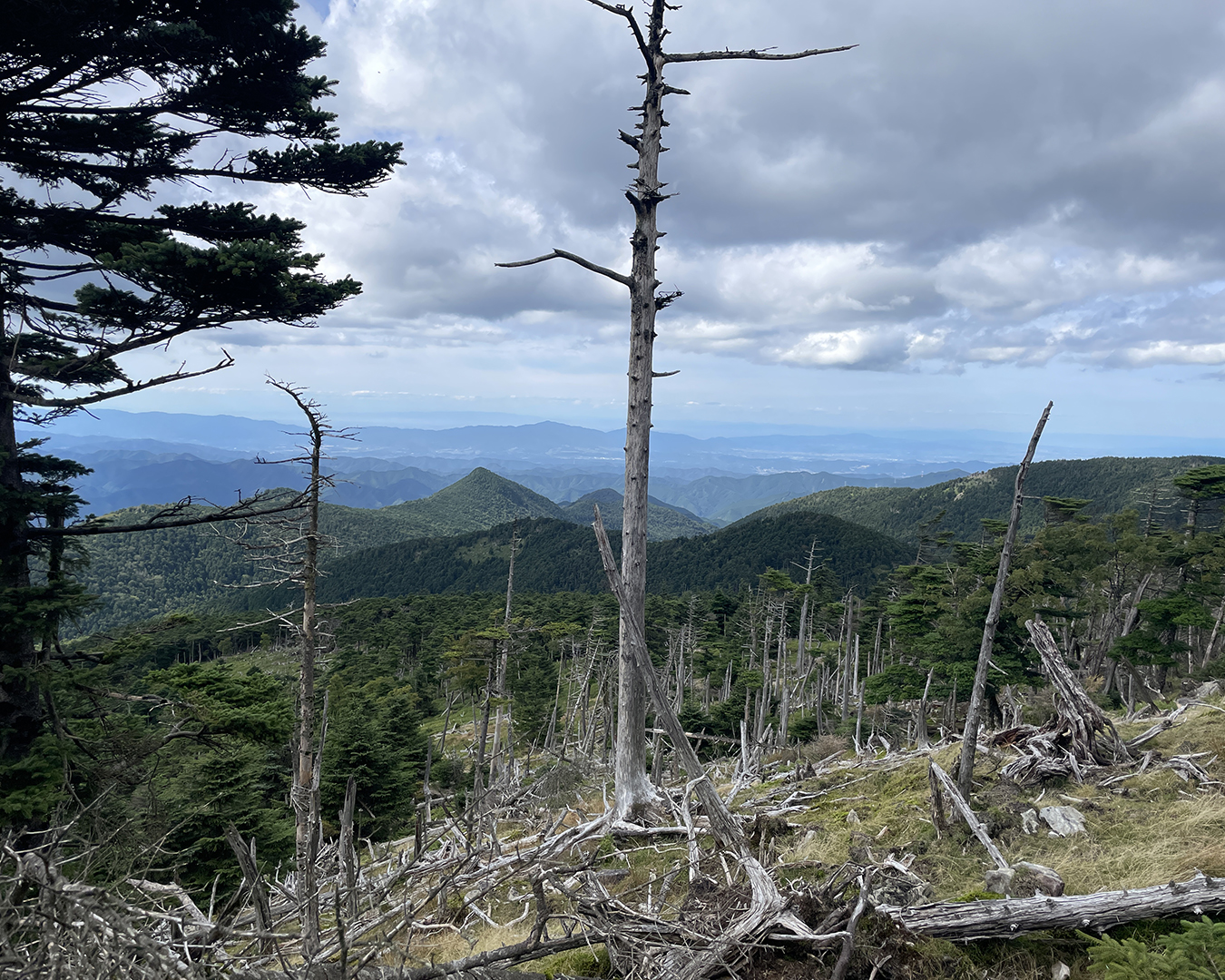 明星ヶ岳付近。植生が変わり、立ち枯れの木と背の低い木々が増えた。