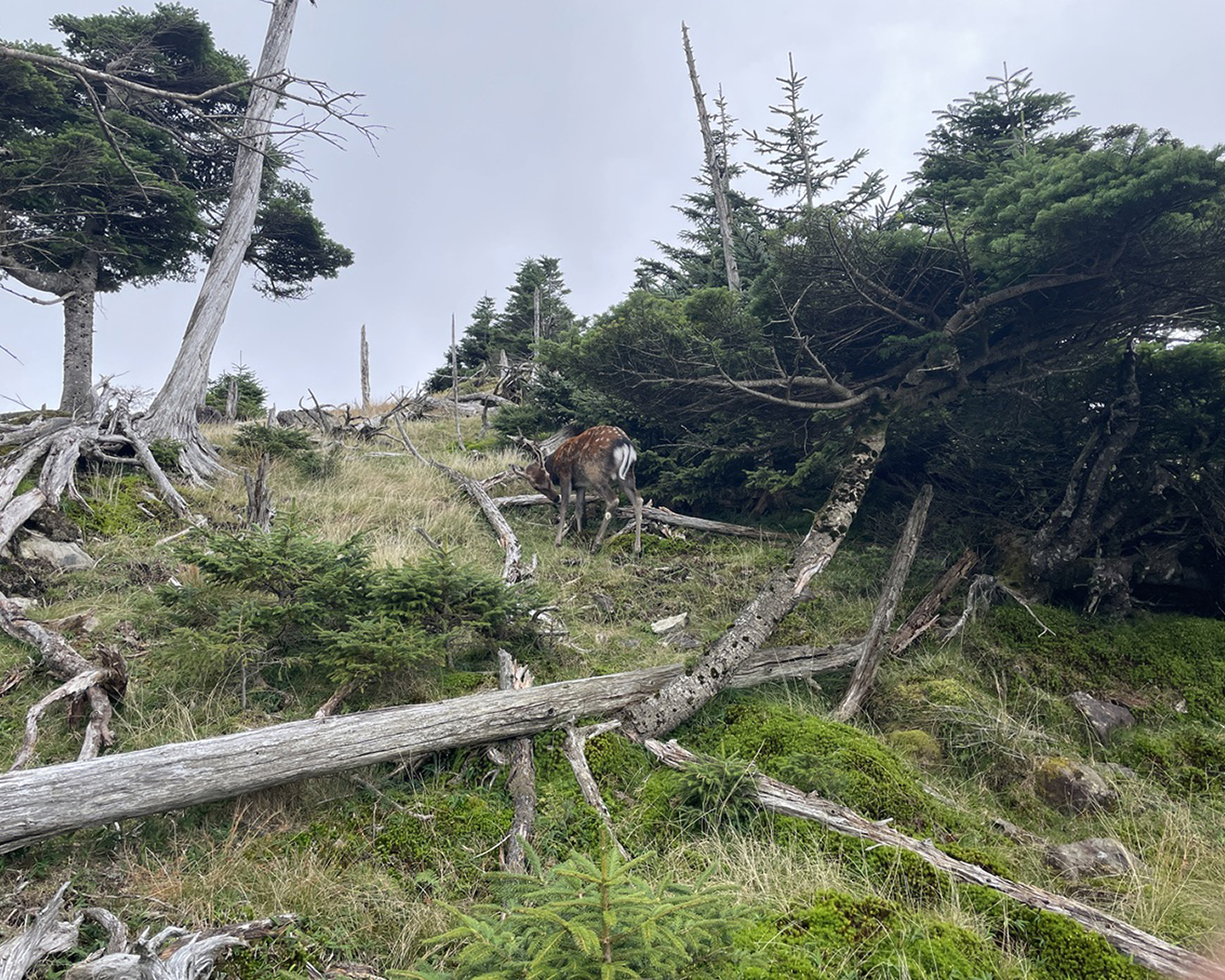 八経ヶ岳を過ぎた辺りで風が止み、全くの静寂であることにふと気が付く。標高が上がってきたせいか、明星ヶ岳辺りでは立ち枯れの木が増えて背の低い植物が中心となり、鳥のさえずりもなく、虫も減ったなぁと考えていると、わずか2mほど前に牡鹿が唐突に現れて息を吞む。