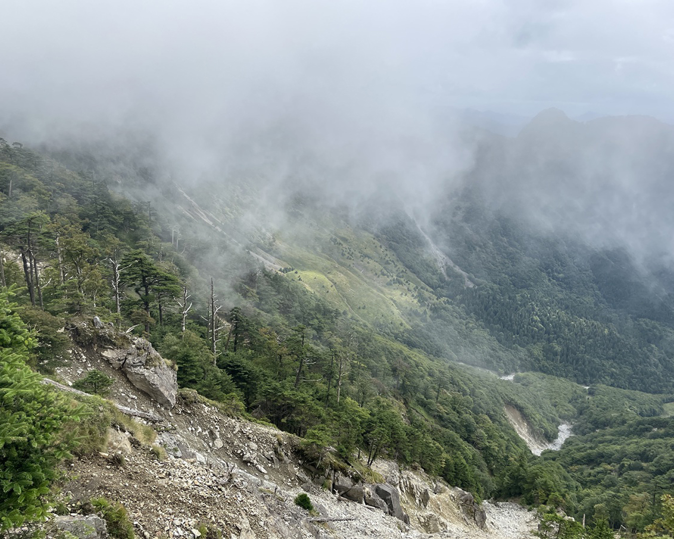 朝6時半、小屋を後にする。湿度は相変わらず高くガスっているものの、雨もようやく上がり、ところどころ日も差している。