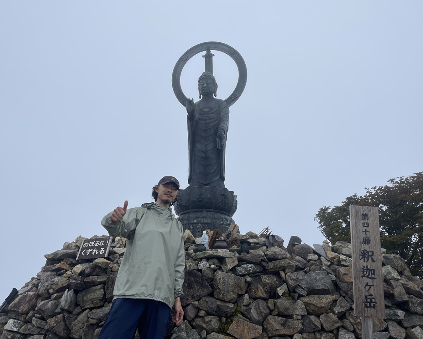 釈迦ヶ岳頂上。地元の方のお言葉に甘えて、この旅で唯一の記念撮影をしてもらった。
