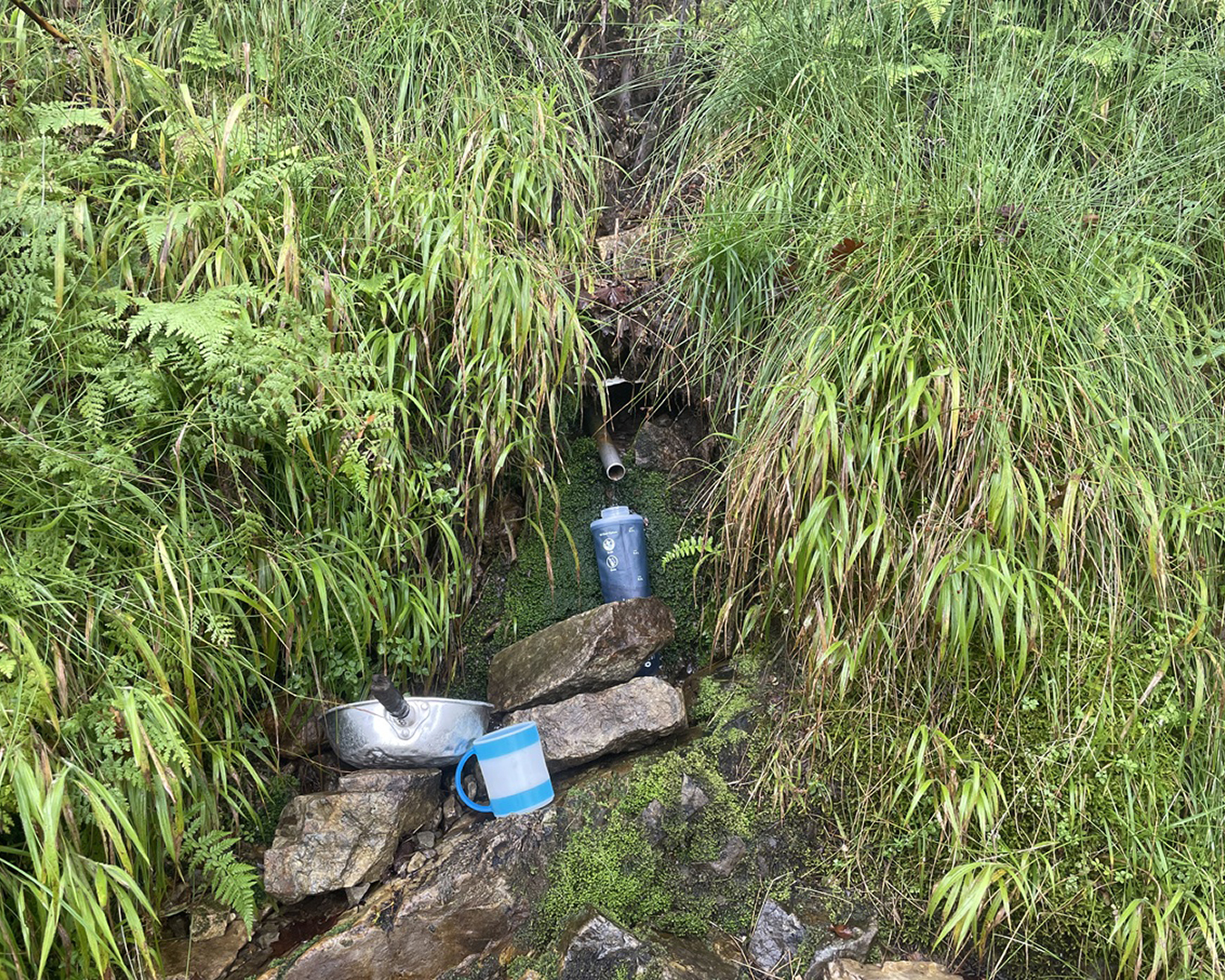 ここまでの道中、地図にあるはずの水場を見つけられなかったので、近くにある水場 「かくし水」まで一旦下り、水を確保する。雨続きなのに水量は少なかったが、30分ほどかけてなんとか必要分の水が確保できたので、折り返して予定地の深仙の宿という無人の避難小屋へ向かう。