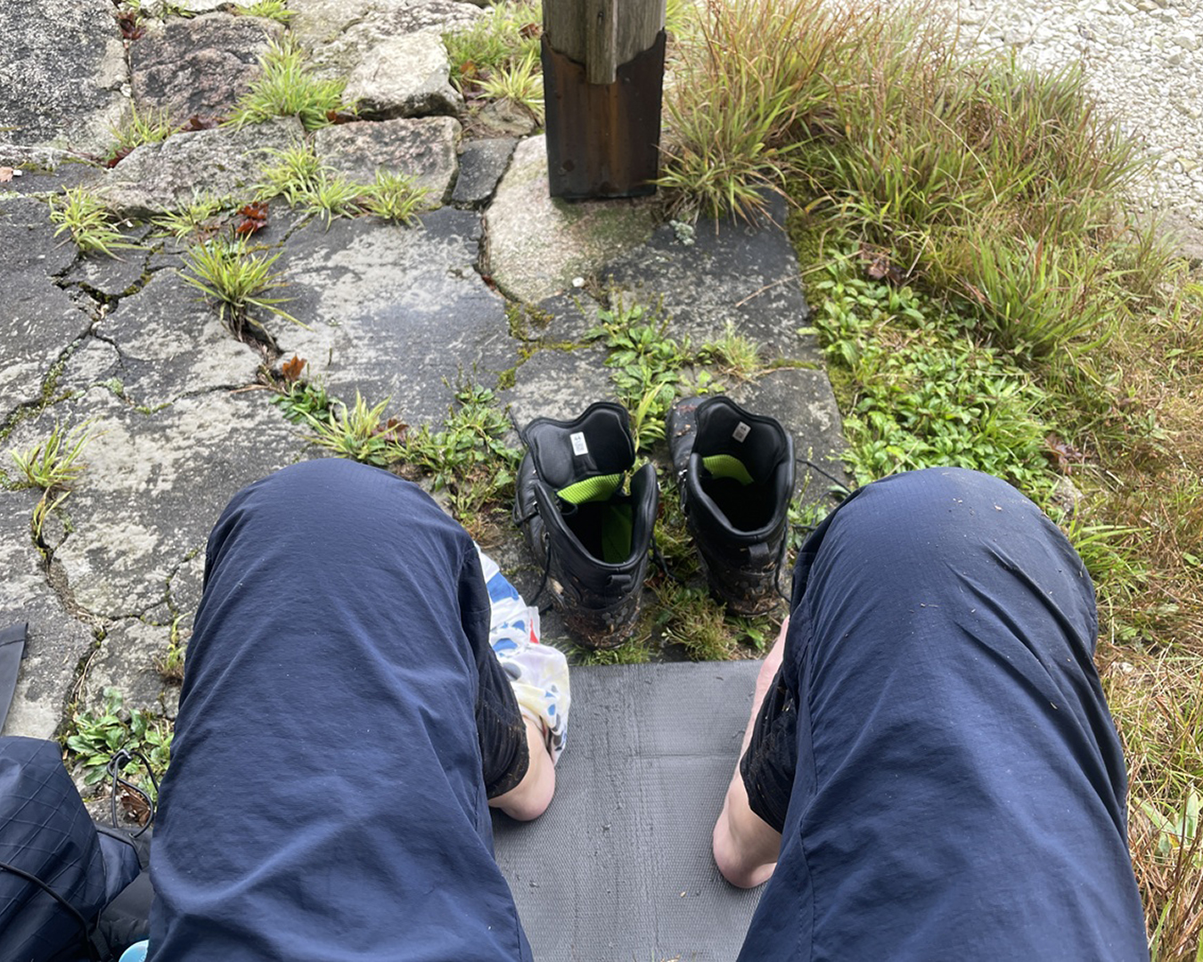 立派な小屋をボランティアで清潔に管理をされていて、大変ありがたいことだと感じ入りながら、汚れた靴を脱ぎ捨て足を休ませていただき、コーラをいただいた。普段はジュースというものを飲まないが、何だかHPが回復したような気になる。濡れた靴下と靴を履くのは嫌だが、靴ひもをしめ直すだけで足に力が蘇る気がする。