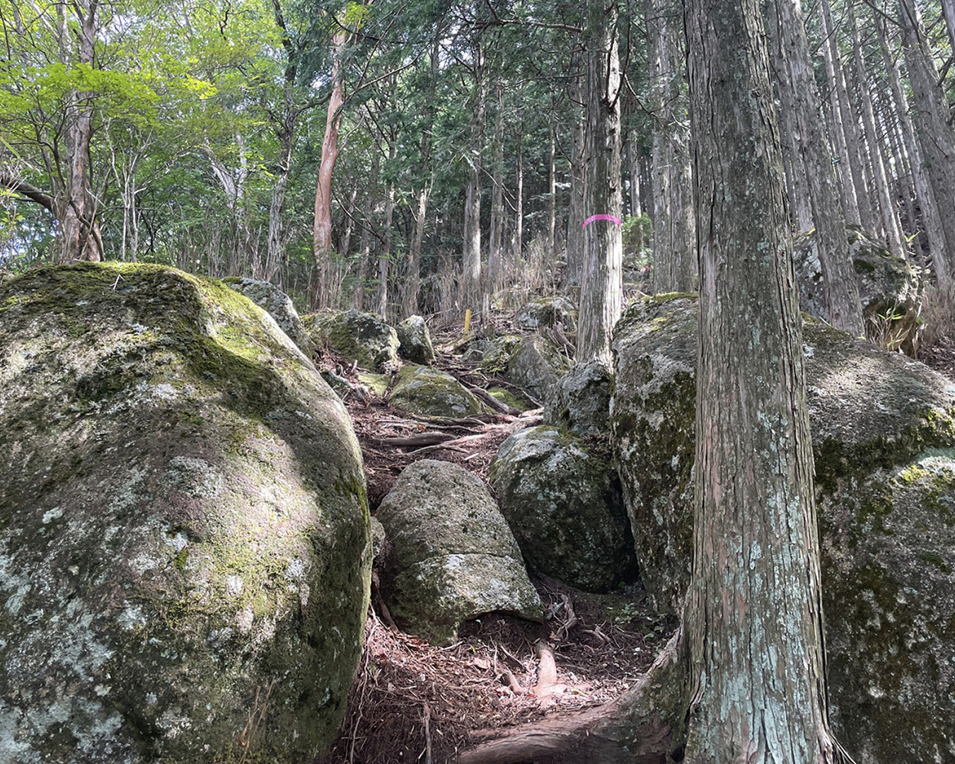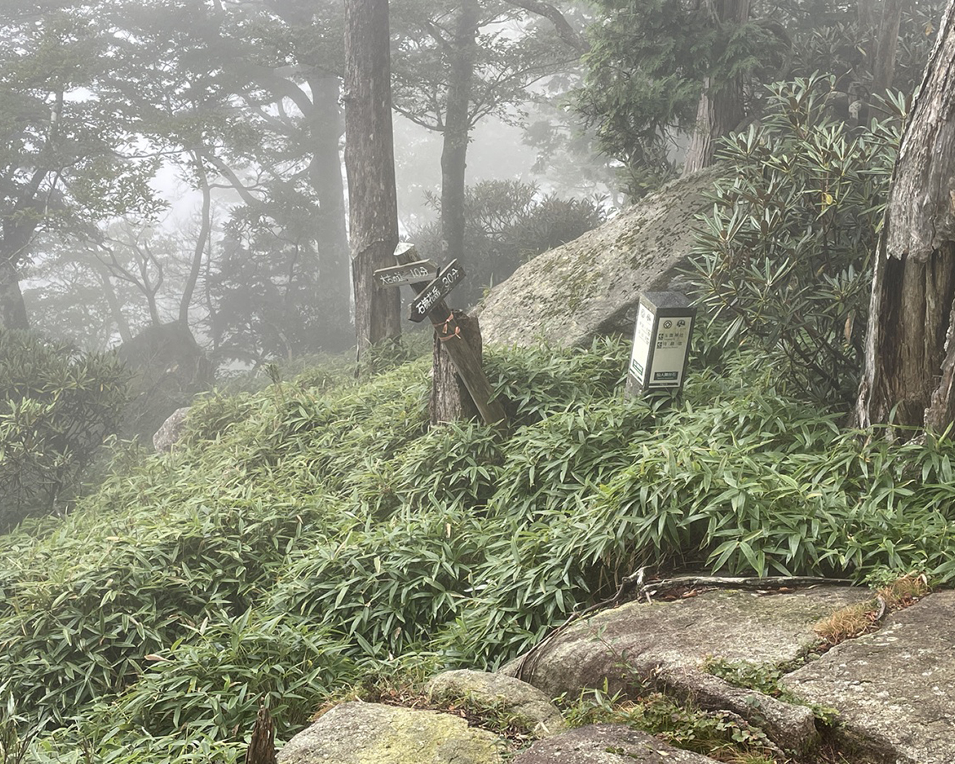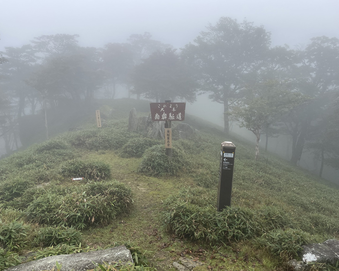 セミが鳴くくらいに気温が上がり、単調な道にペースも上がらず、自然と立ち止まることが増え、半ばヤケクソになってきた。人里の気配と旅路の終わりをチラつかせる林道との交差点が増え、時には“近道”という悪魔のささやきのような看板なども織り交ぜながら、何度も奥駈道の標識で再び歩きづらい山道へと引き戻される。急坂を登っては下りてを繰り返し、誰かの悪意のようなモノすら感じる。