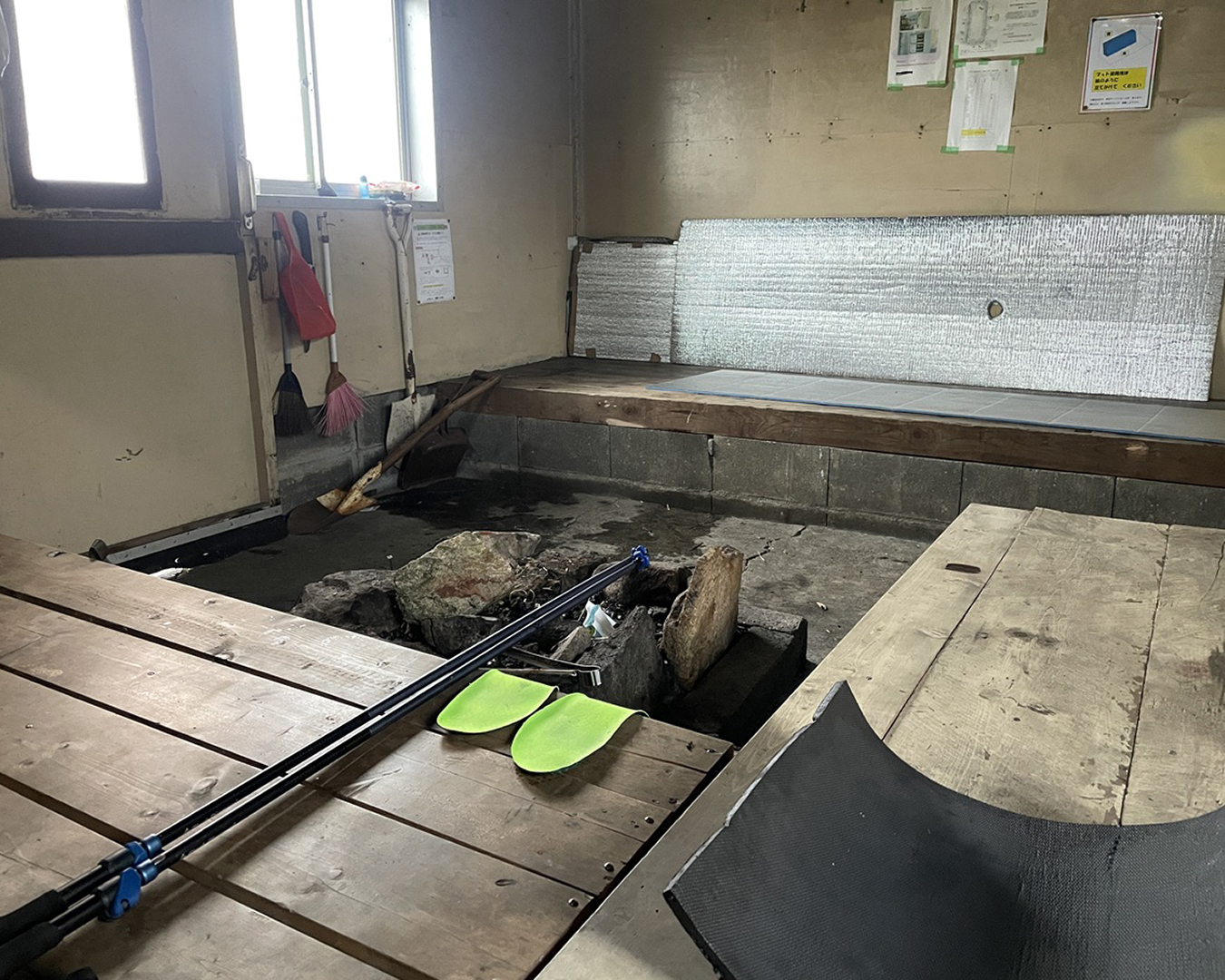 濡れた服を囲炉裏で乾かそうと思ったが、残念ながら薪が湿っていて諦めた。