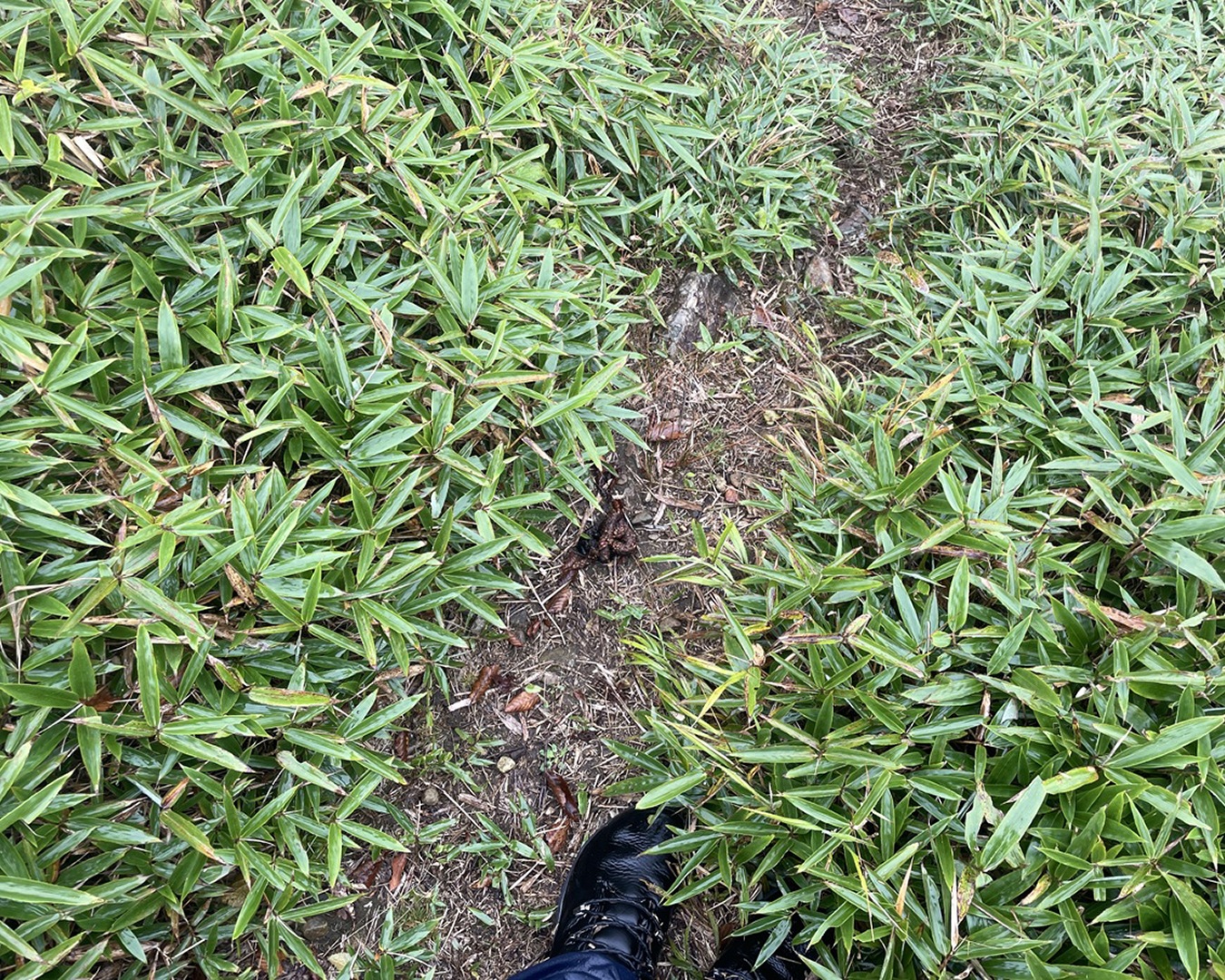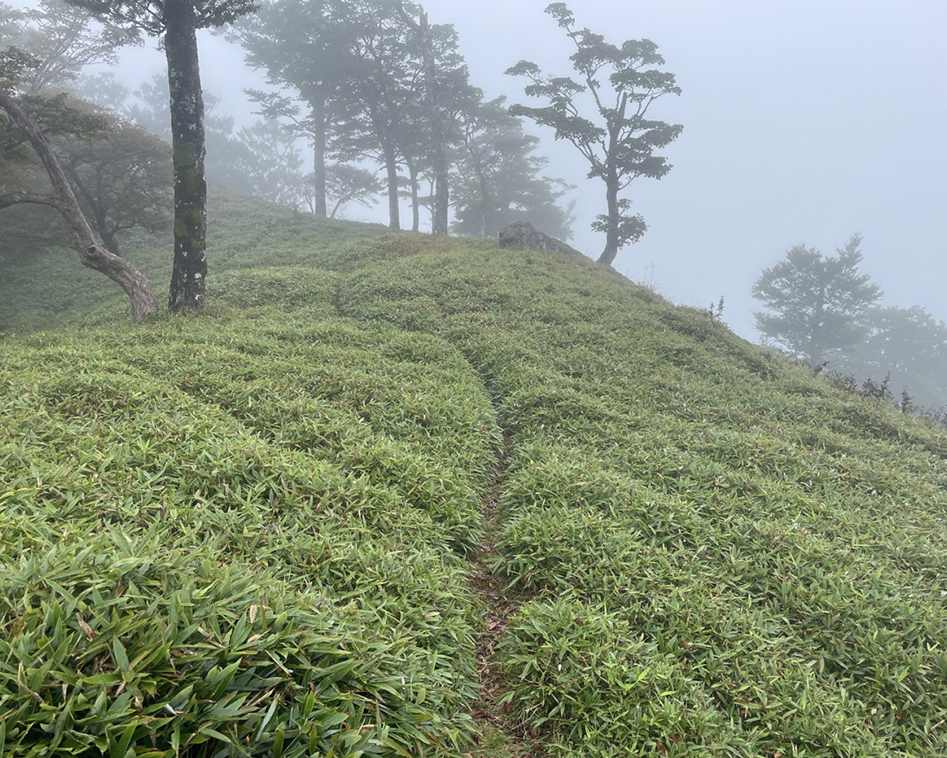 笹の背が低い場所でも道幅が30〜40cmほどしかないため、足元が見えづらく歩きにくい。