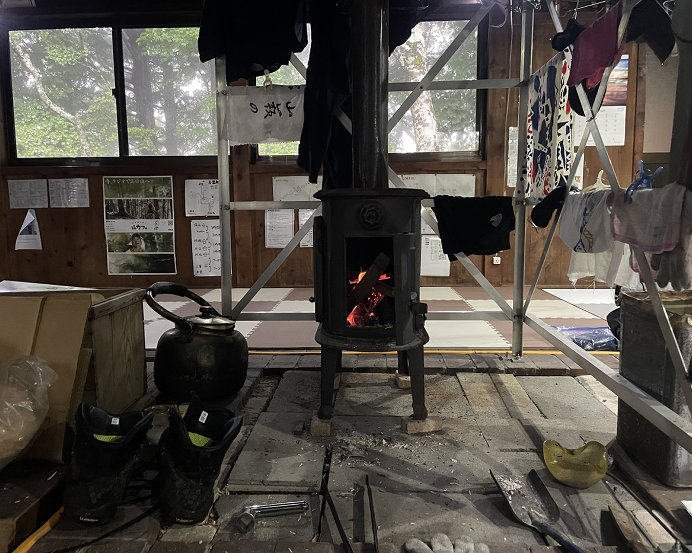 雨が収まる様子もないので今夜も小屋泊とさせてもらうことにして、薪ストーブに火を焚べ、びしょ濡れになった衣服をすべて脱ぎ乾かす。焚き火をしているだけで心が落ち着く。あと2日で終わりだと思うと少し寂しいような誇らしいような気もする。