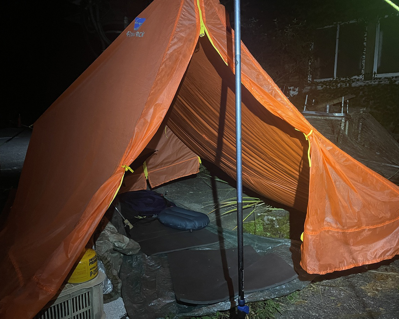 これまで今回の旅で使ったツェルトか、バスタブ付きタープ、ダブルウォールテントでしか寝たことがなかったが、意外と眠れるもので、そのまま3〜4時間ほど眠りに落ちた。風が少し強くなってきたので売店の軒先へと寝床を移す。標高も1,000mくらいまで下がっていることもあり、寒くはないが朝まで熟睡というわけにはいかないだろう。何なら暗いうちから活動してしまうのもアリかと、いつぞや社内メンバー有志が行なっていた“ナイトハイク”なるものがうっすら頭にちらつく。
