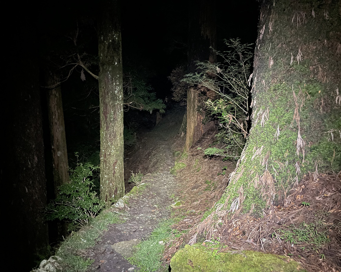 初めての経験に何だかワクワクする。ヘッドライトの消耗を抑えるために低ルクスにして、道幅が30cmほどしかない荒れた道を1歩ずつ足元を確かめながら進む。足裏に痛みがあるが、気力は充分で、夜明けまでの時間を楽しめそうな感じがする。ところが、30分ほど進んだあたりで、ヘッドライトが点滅し、まさかのバッテリー切れ…。