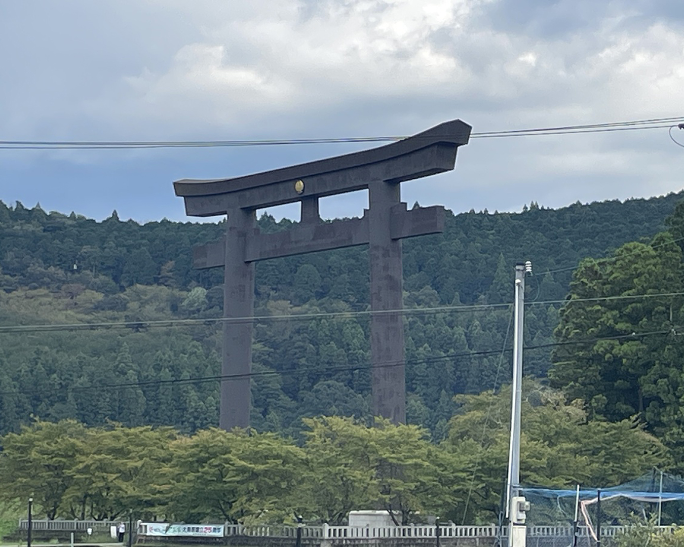 大斎原大鳥居。2000年造のコンクリート製だが、高さ約33.9m、幅約42mで日本一の大きさを誇る。