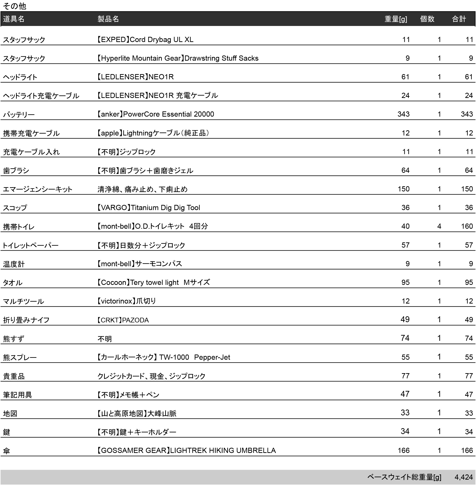 パッキング完了。ベースウェイトが4.24kg。食糧約3kgと水4.5Lを入れると、総重量11〜12kgほどになった。THREEを快適に背負える重量である10kgを超えてしまったが、現状ではこれ以上削れる気がしなかった。
