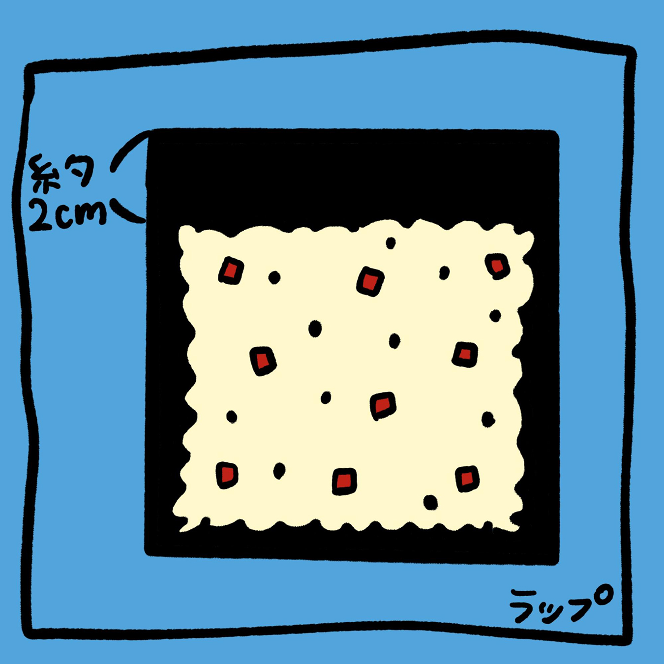 ③ラップに海苔を敷き、混ぜておいたご飯を海苔の上に広げる。この時、上部分2cmを糊付け用に空けておく。