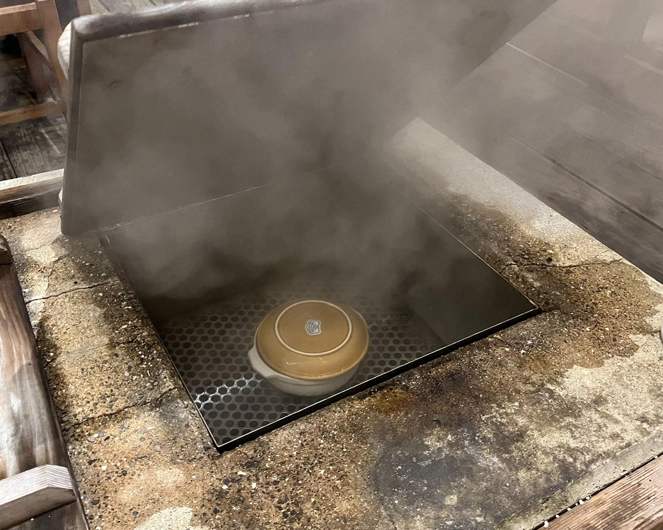 噂の温泉蒸し。蒸し場はたくさんあるが、食事時にはいつも人でいっぱいになる。