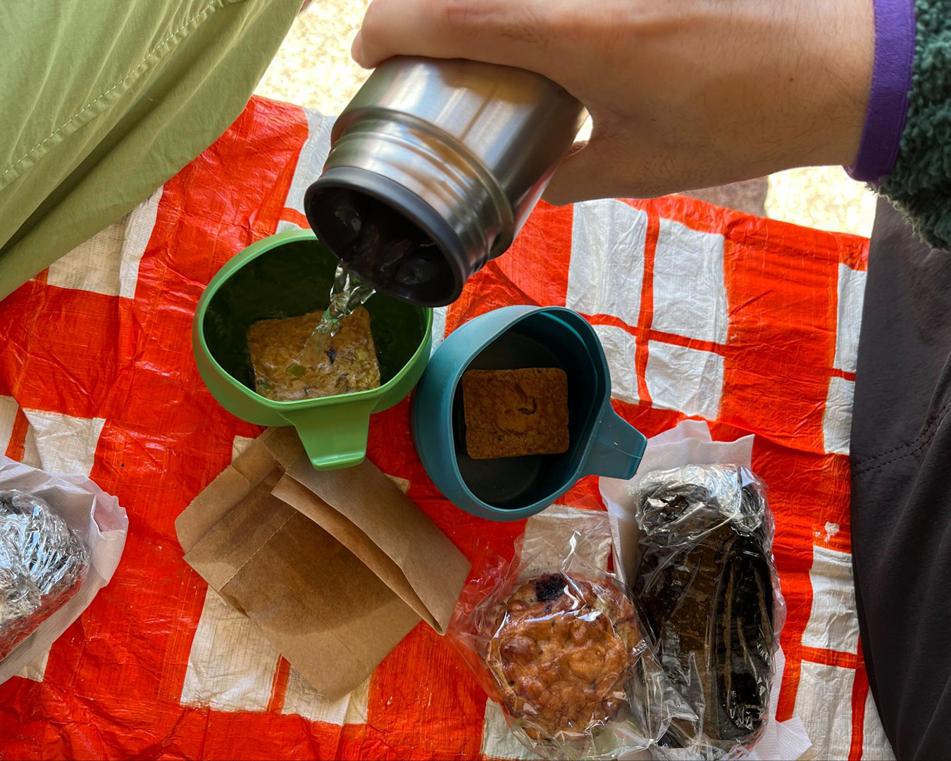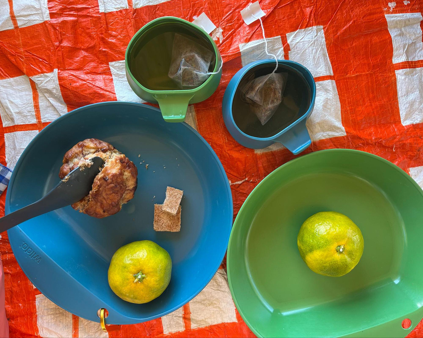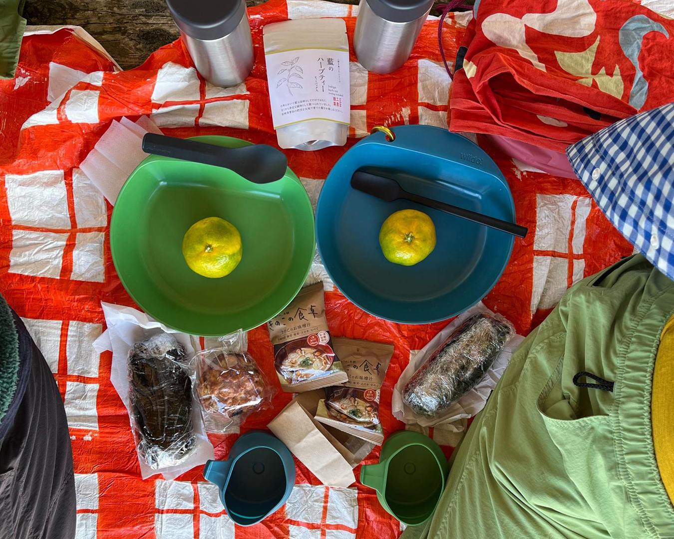 2本のタンブラーには宿で沸かしてきたお湯を入れてきた。それぞれフリーズドライのスープと、食後のハーブティーに使う。「スープ→海苔巻き→おやつ→ハーブティー→お口直しのみかん」という完璧な流れが計算されている。