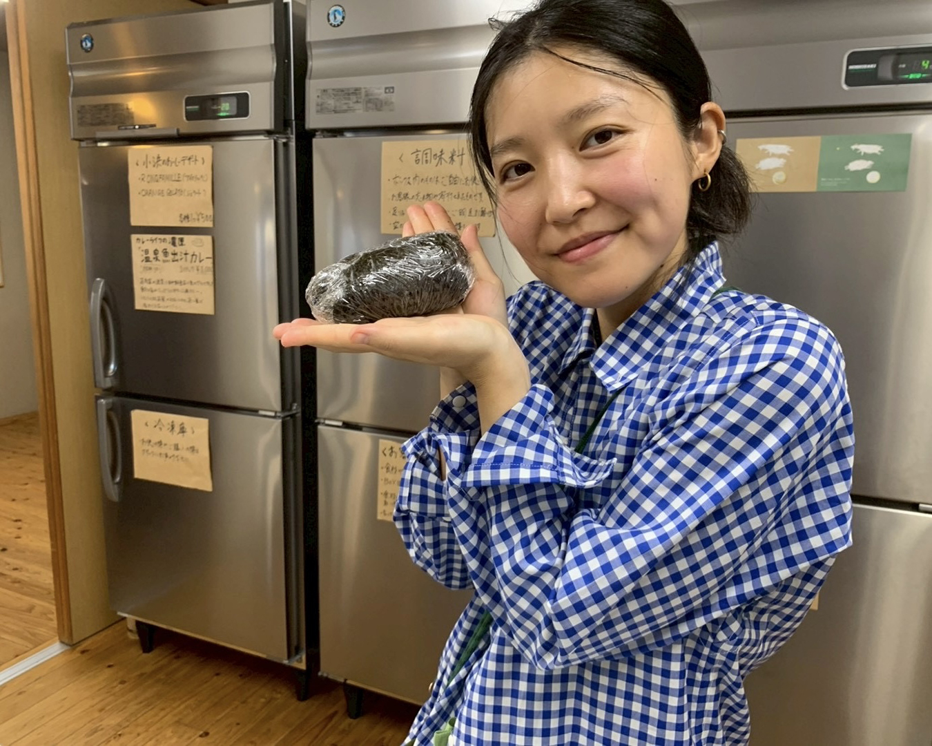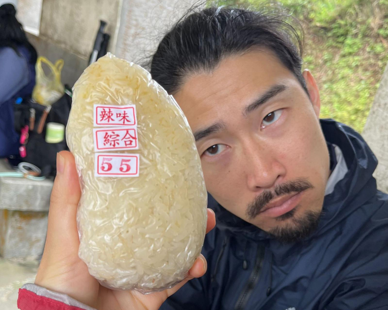 顔ほどのサイズがある、餅米のどっしりでっかいおにぎりだ!