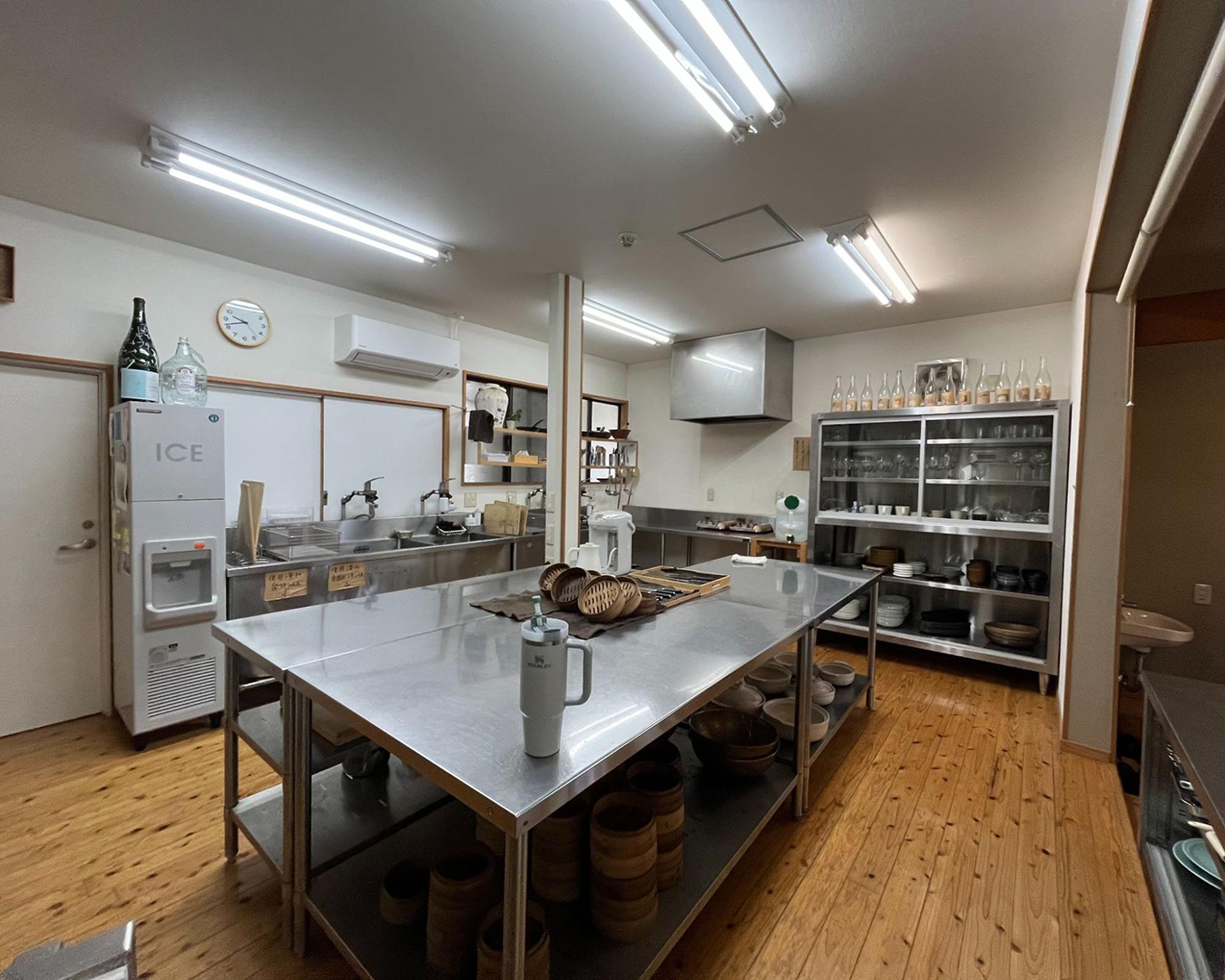 湯宿 蒸気屋さんのキッチン。宿泊客でシェアするので広い。塩などの基本的な調味料が揃っていてありがたい。