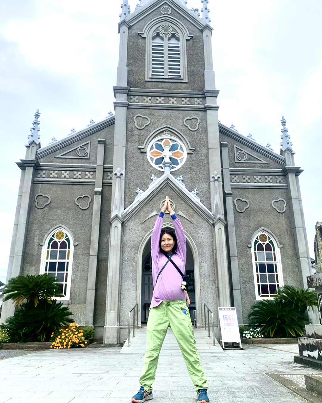 天草にある世界文化遺産の﨑津教会ではしゃぐ妊婦寒川