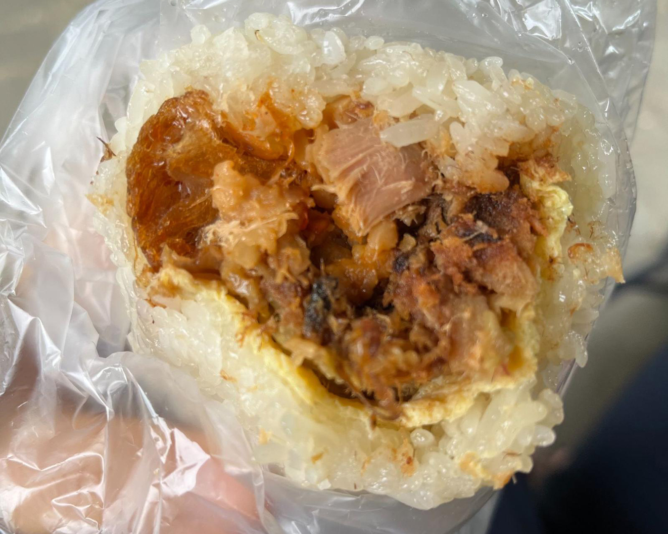 中には豚肉のフレークや卵、高菜漬けなどが入っていた。