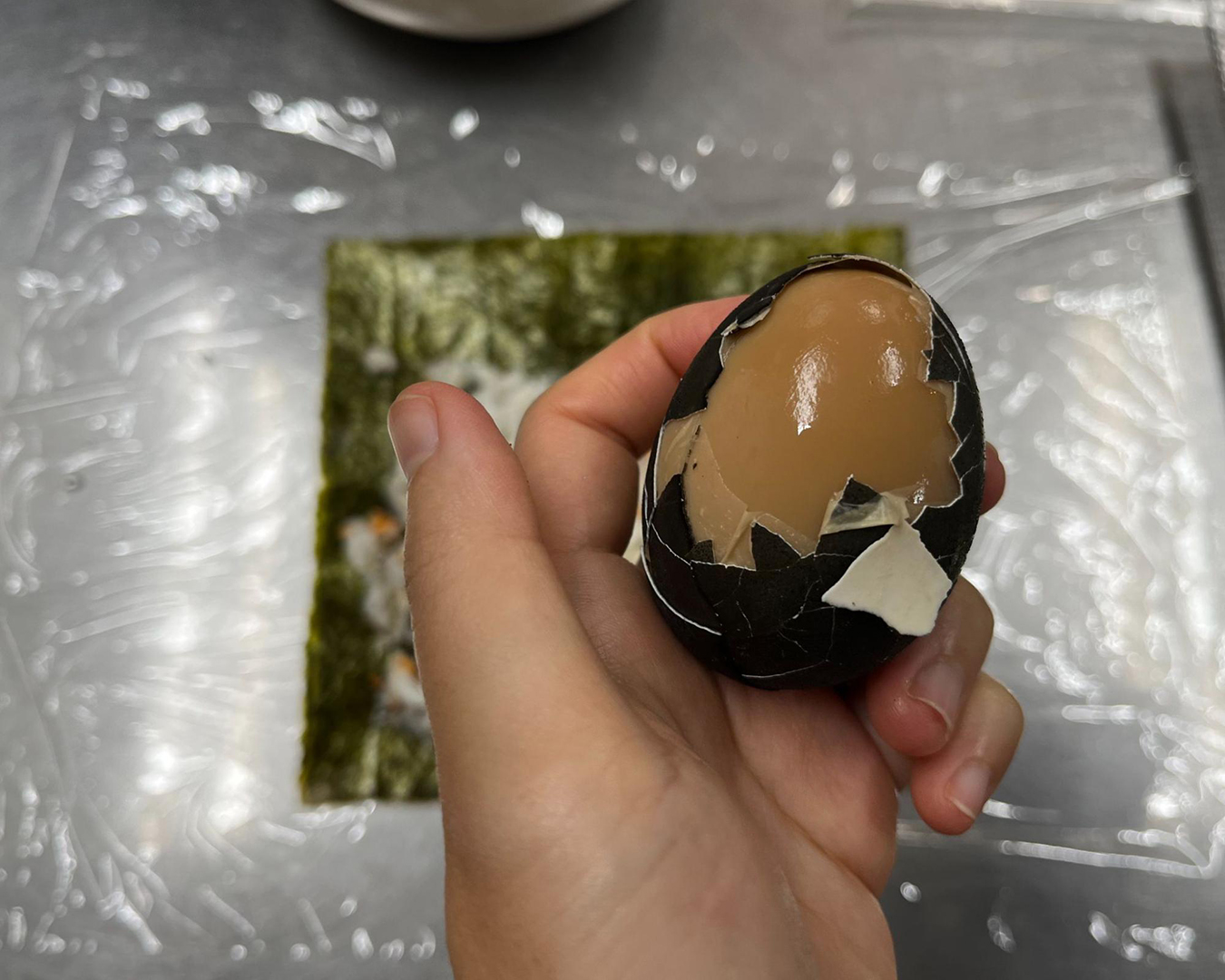 食い意地だの食いしん坊だの言っていたのに、具材が少なくない?と思ったそこのあなた、心配ご無用。以前、ともさんと台湾に行った際に食べた飯糰(ファントン:もち米を使い、中に煮卵、肉そぼろ、高菜漬け、揚げパンなどを入れて棒状に握った台湾式のおにぎり)にインスピレーションを得た海苔巻きにしようと思っていたので、具材には雲仙の温泉蒸しのゆで卵をまるまるひとつ入れるのだ。