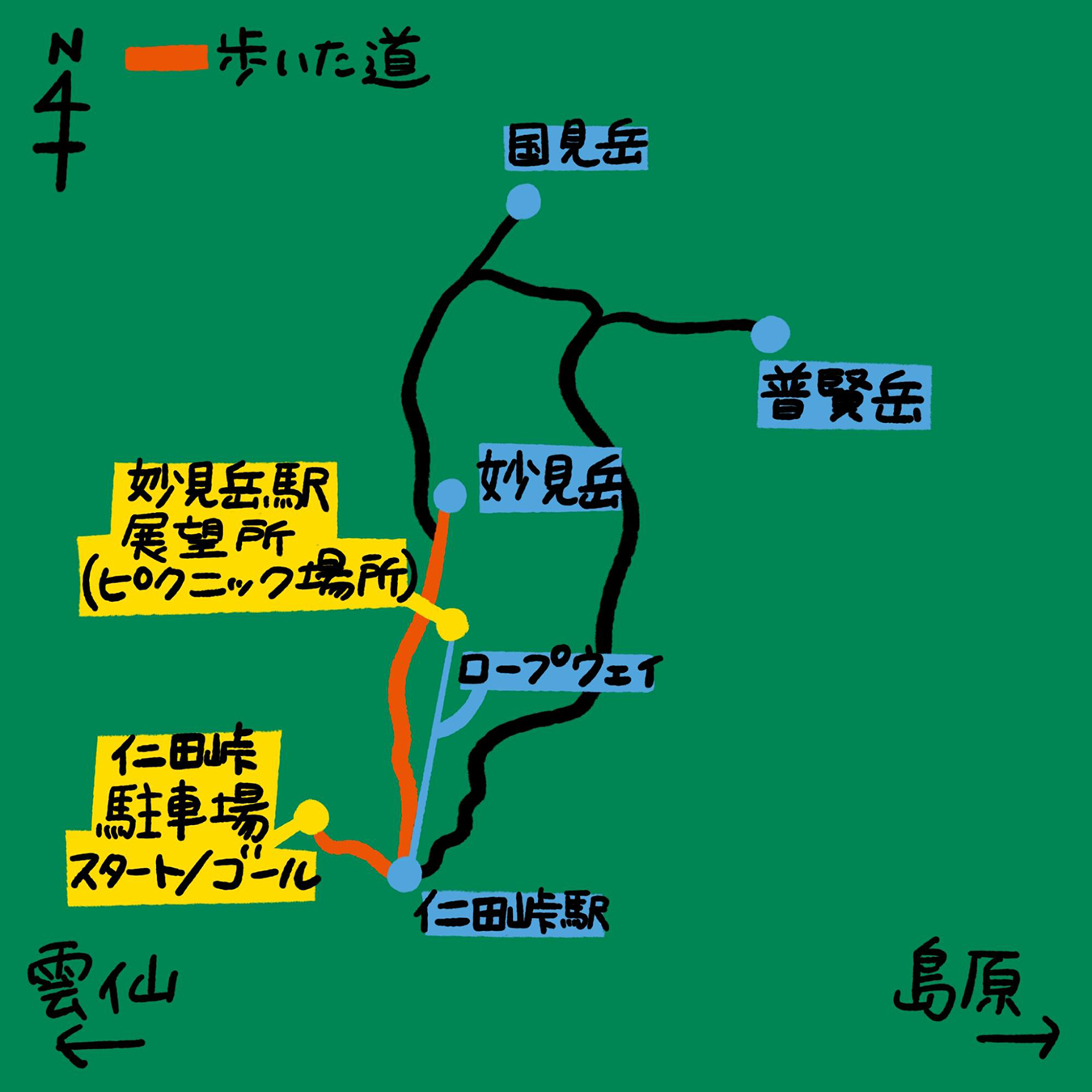 仁田峠駐車場からスタートし、妙見岳山頂を目指すシンプルなコース。登りの所要時間は40分〜1時間ほど。ロープウェイなら所要時間は3分。展望所からは雲仙・普賢岳や島原が望める。