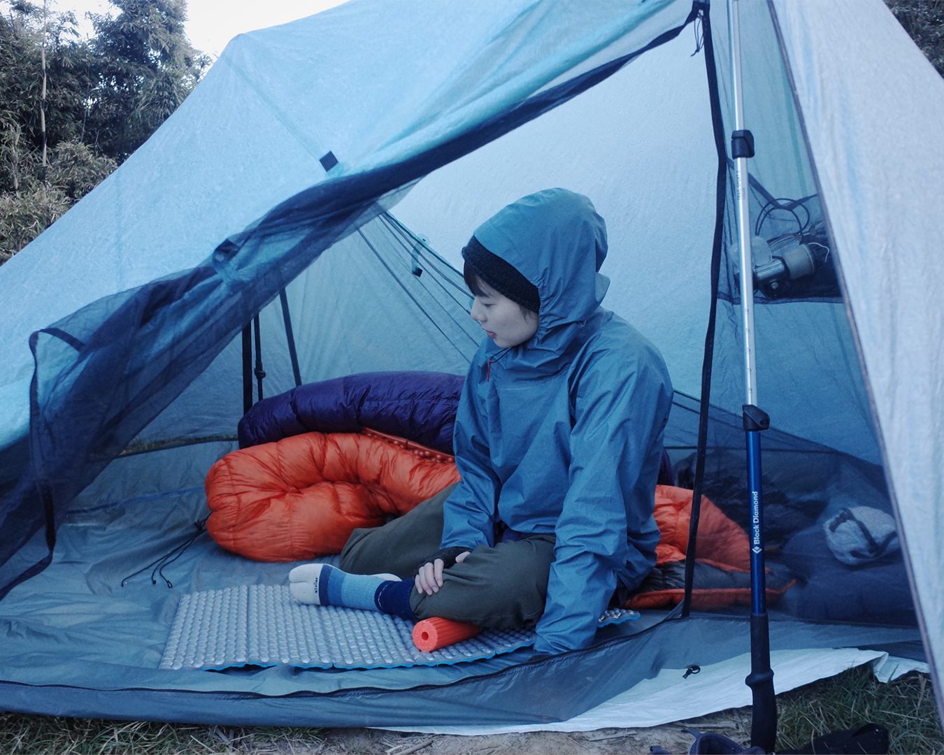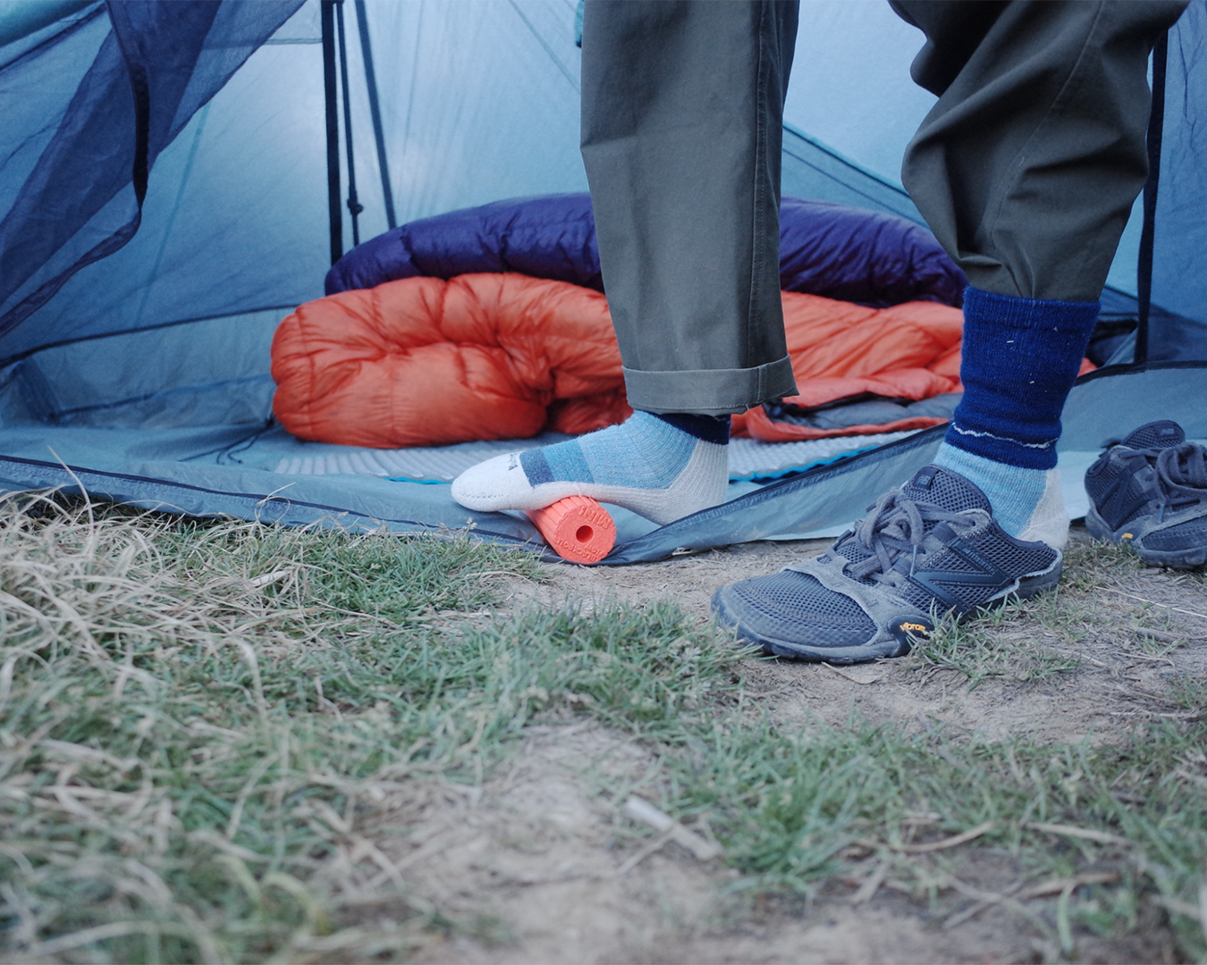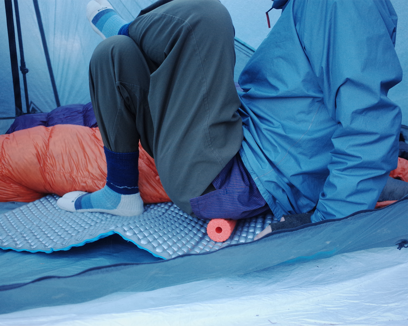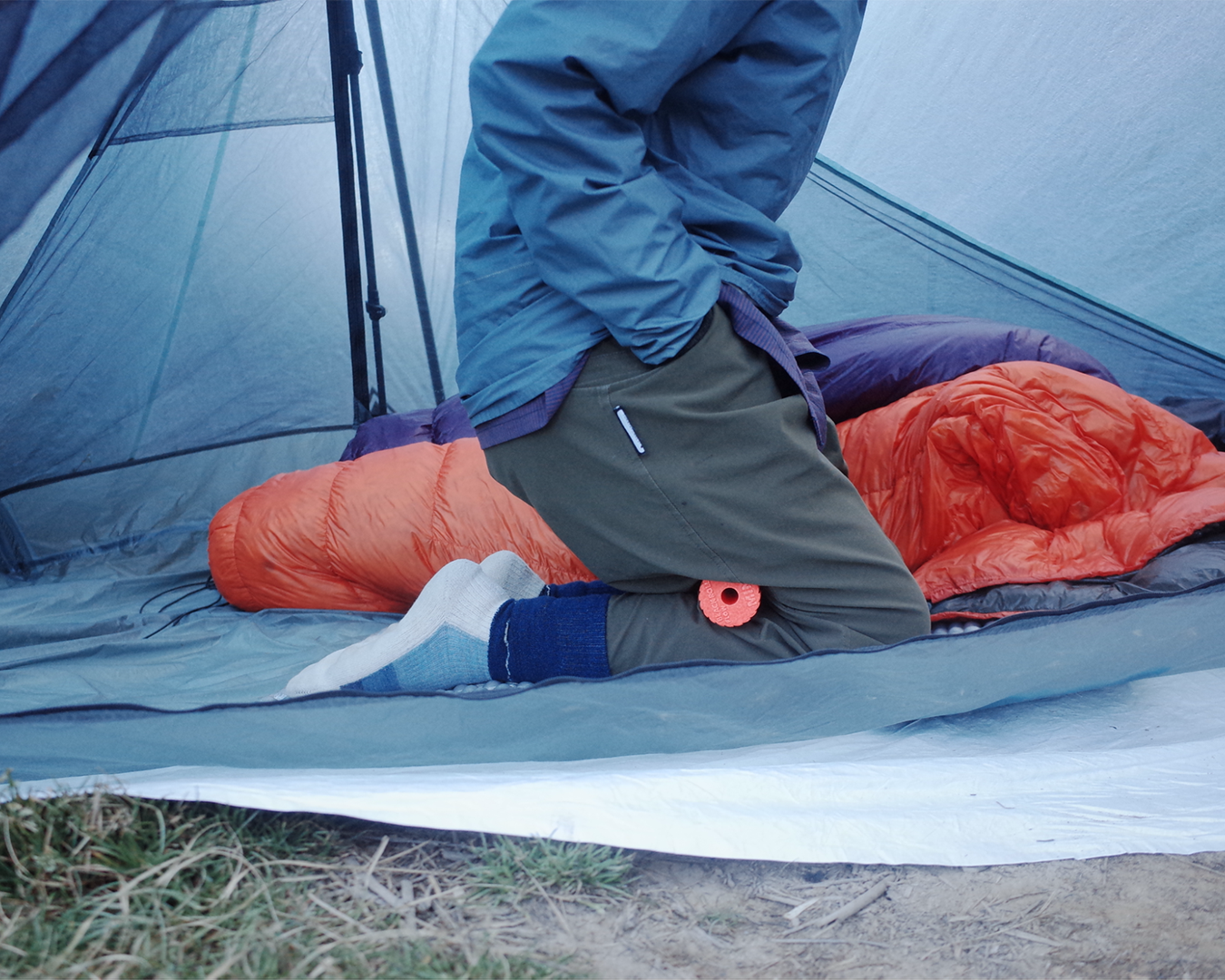 テント場に辿り着いたら、いよいよ「深く」身体を緩める時間の始まりです。歩き続けてきた身体を一度立ち止まらせ、呼吸を整えながら、山の時間に身を委ねていきます。使う道具はミニフォームローラー。これを使って、下半身の各部位をより深くほぐしていきます。ローラーは筋肉の向きに対して垂直に当て、緩めたい部位に全体の重心をしっかり乗せるのがポイントです。