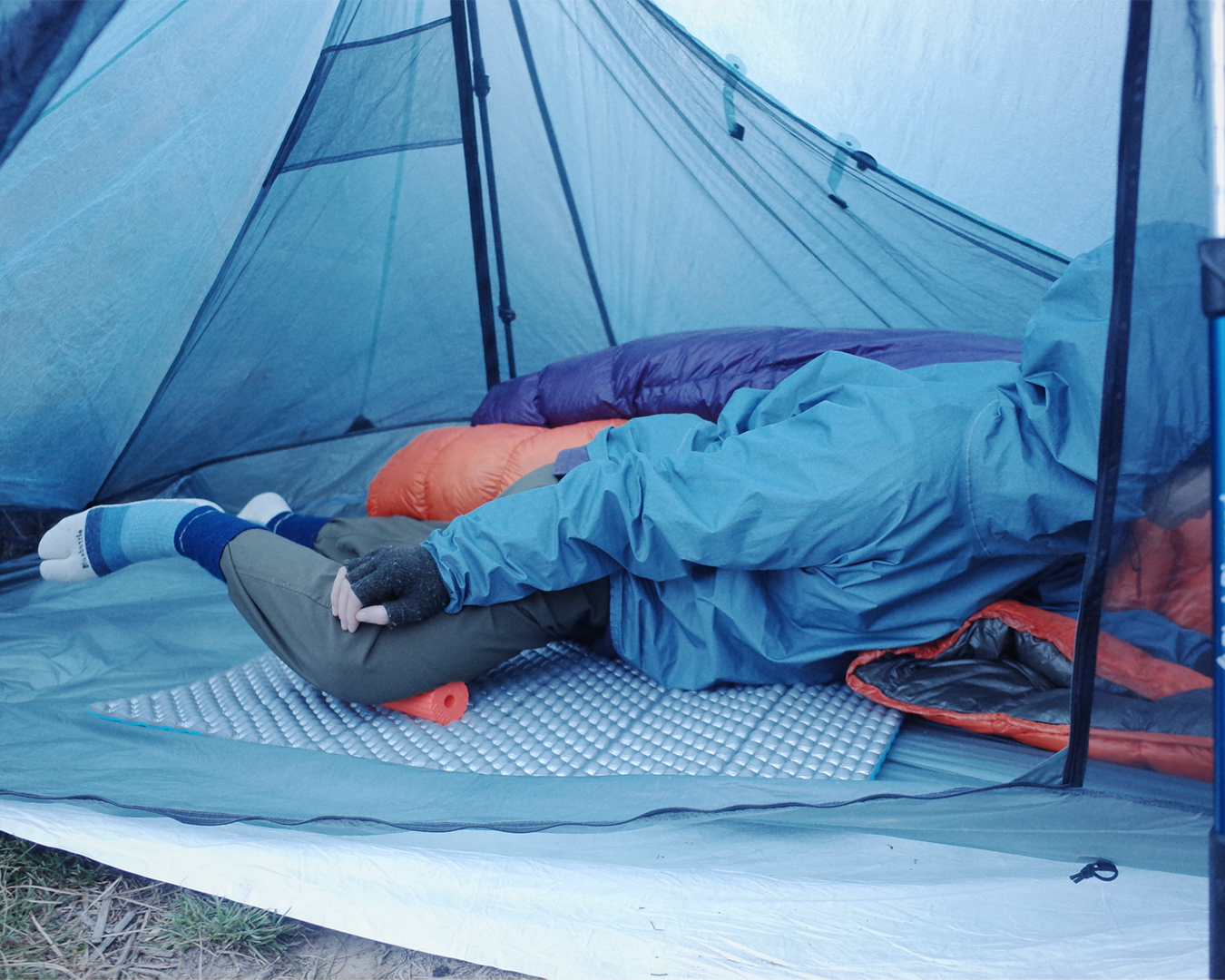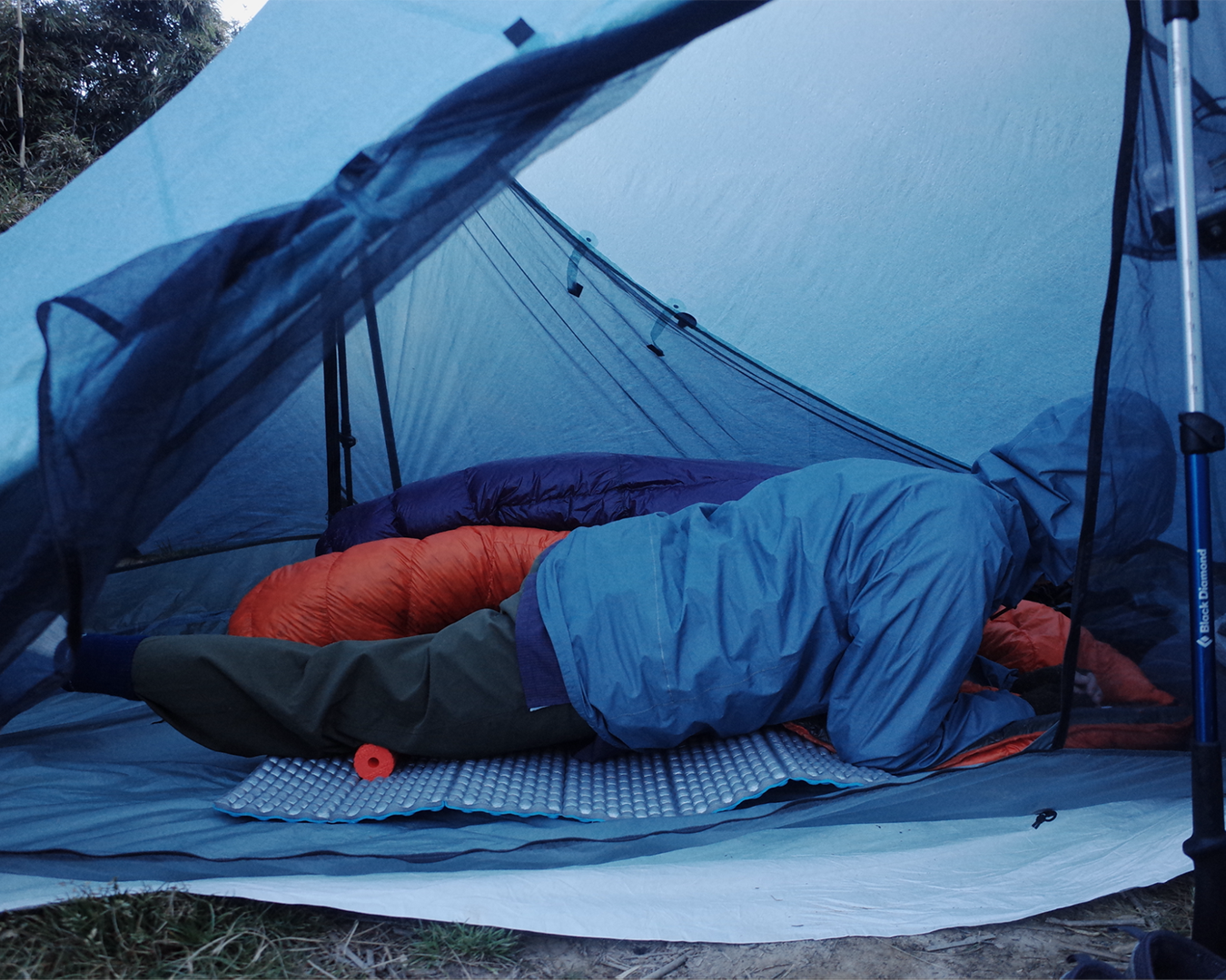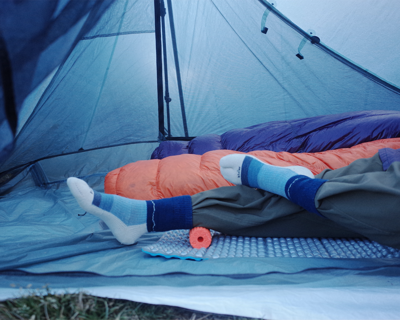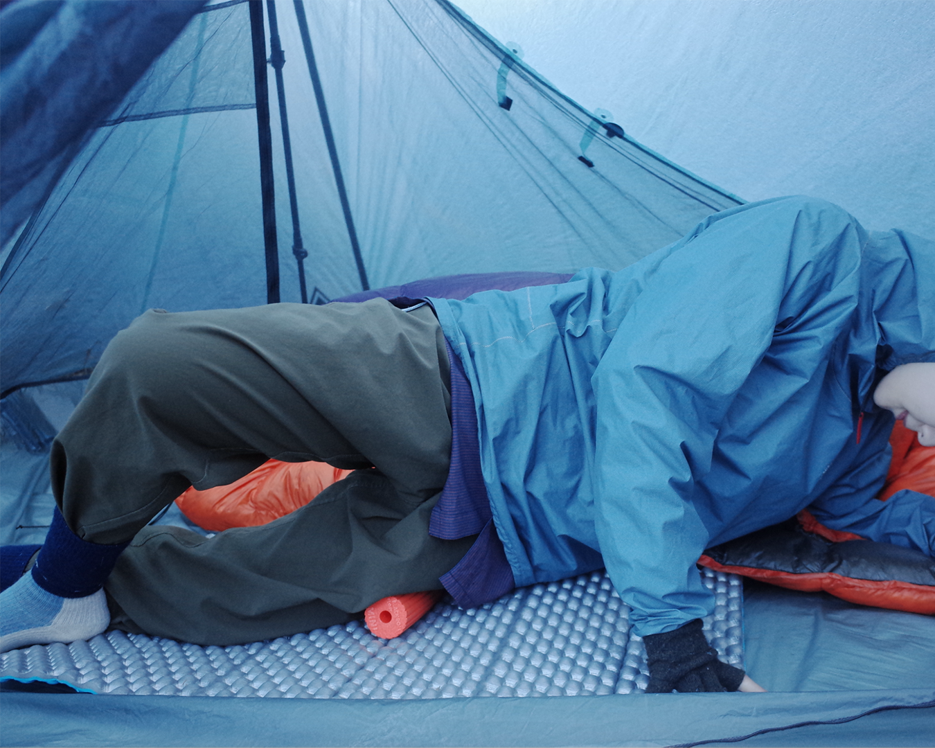 テント場に辿り着いたら、いよいよ「深く」身体を緩める時間の始まりです。歩き続けてきた身体を一度立ち止まらせ、呼吸を整えながら、山の時間に身を委ねていきます。使う道具はミニフォームローラー。これを使って、下半身の各部位をより深くほぐしていきます。ローラーは筋肉の向きに対して垂直に当て、緩めたい部位に全体の重心をしっかり乗せるのがポイントです。