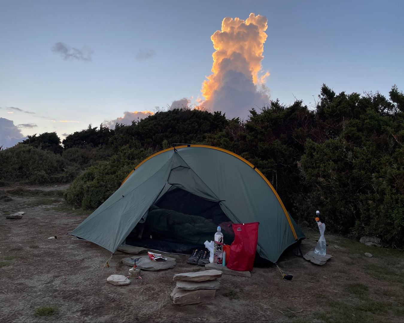 幕営の準備をしていると、下山するところだった1組の登山者に出会いました。「ここ、いいですよ」と、気持ち良く場所を譲ってくれて、テントを移すよう声をかけてくれます。おかげで、キャンプ地選びに悩む必要もありませんでした。