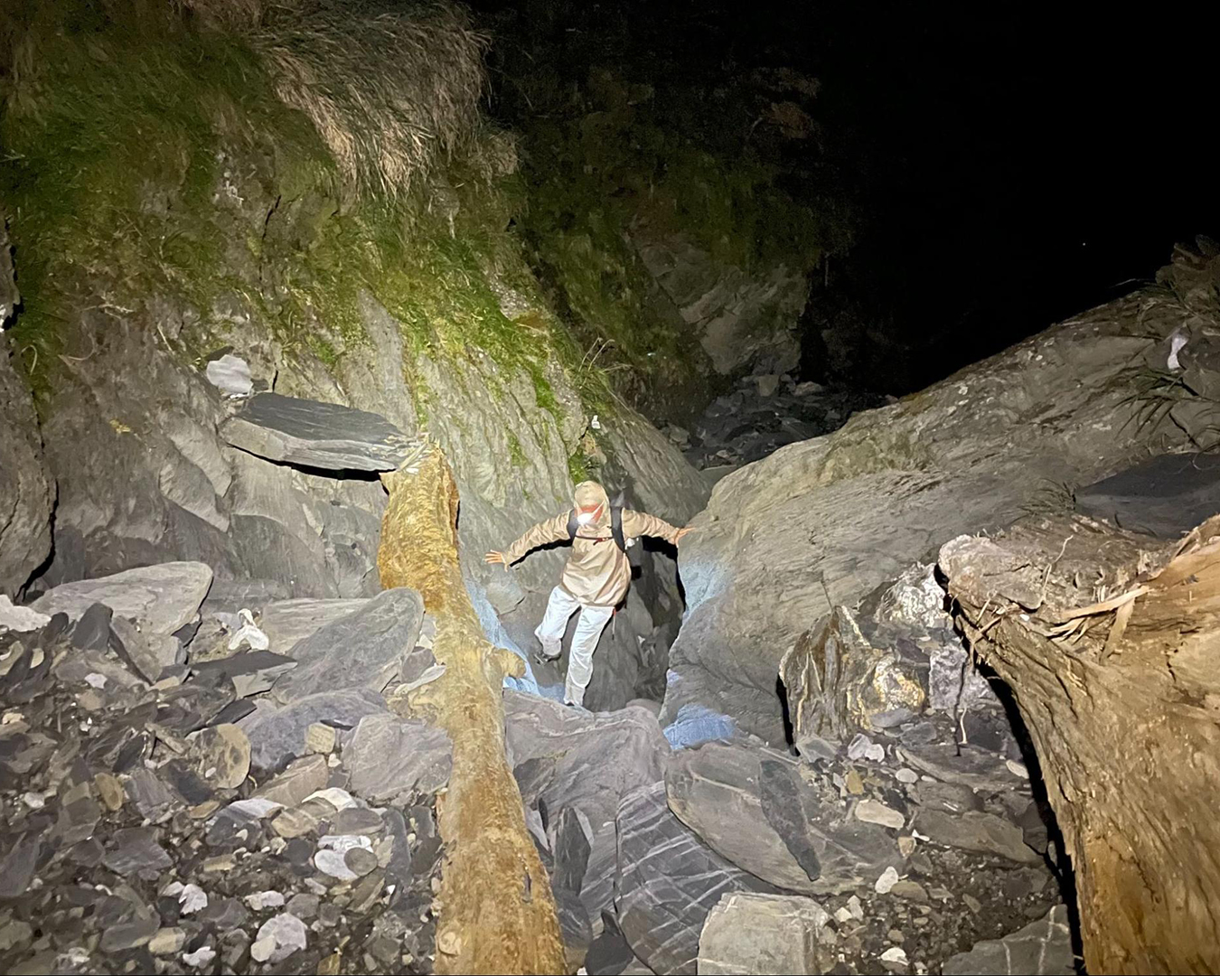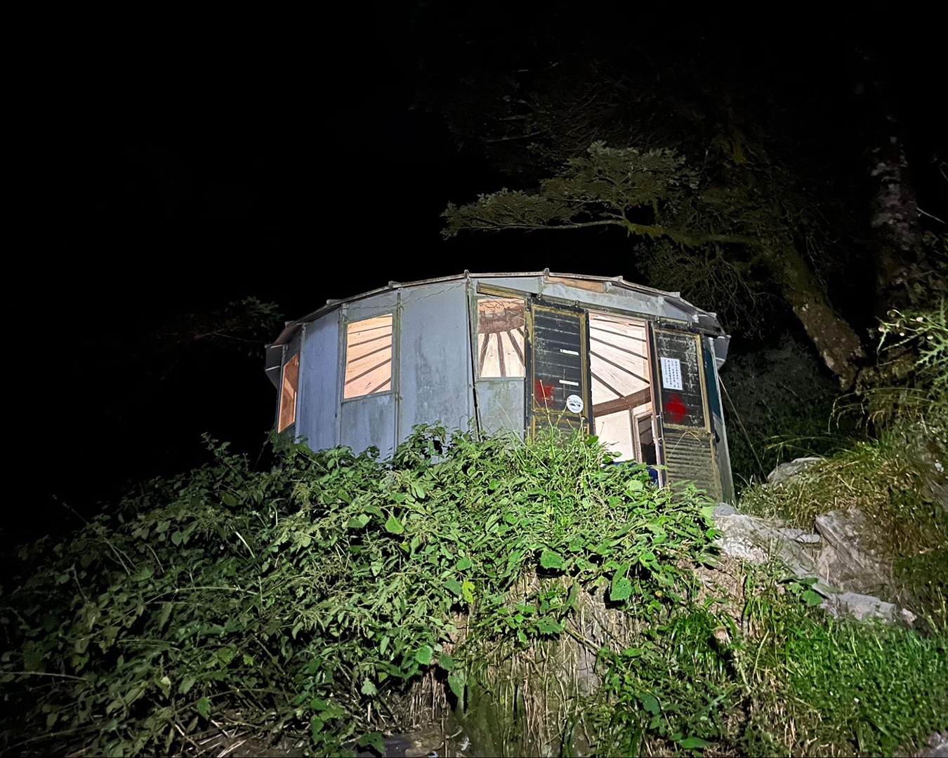 成功二号避難小屋に着いた頃には、すでに辺りは真っ暗。正直、外観は少し怖さもありましたが、ちょうど5人組の兄貴たちに出会ったところ、一気に心強い雰囲気になり、安心感が高まりました。