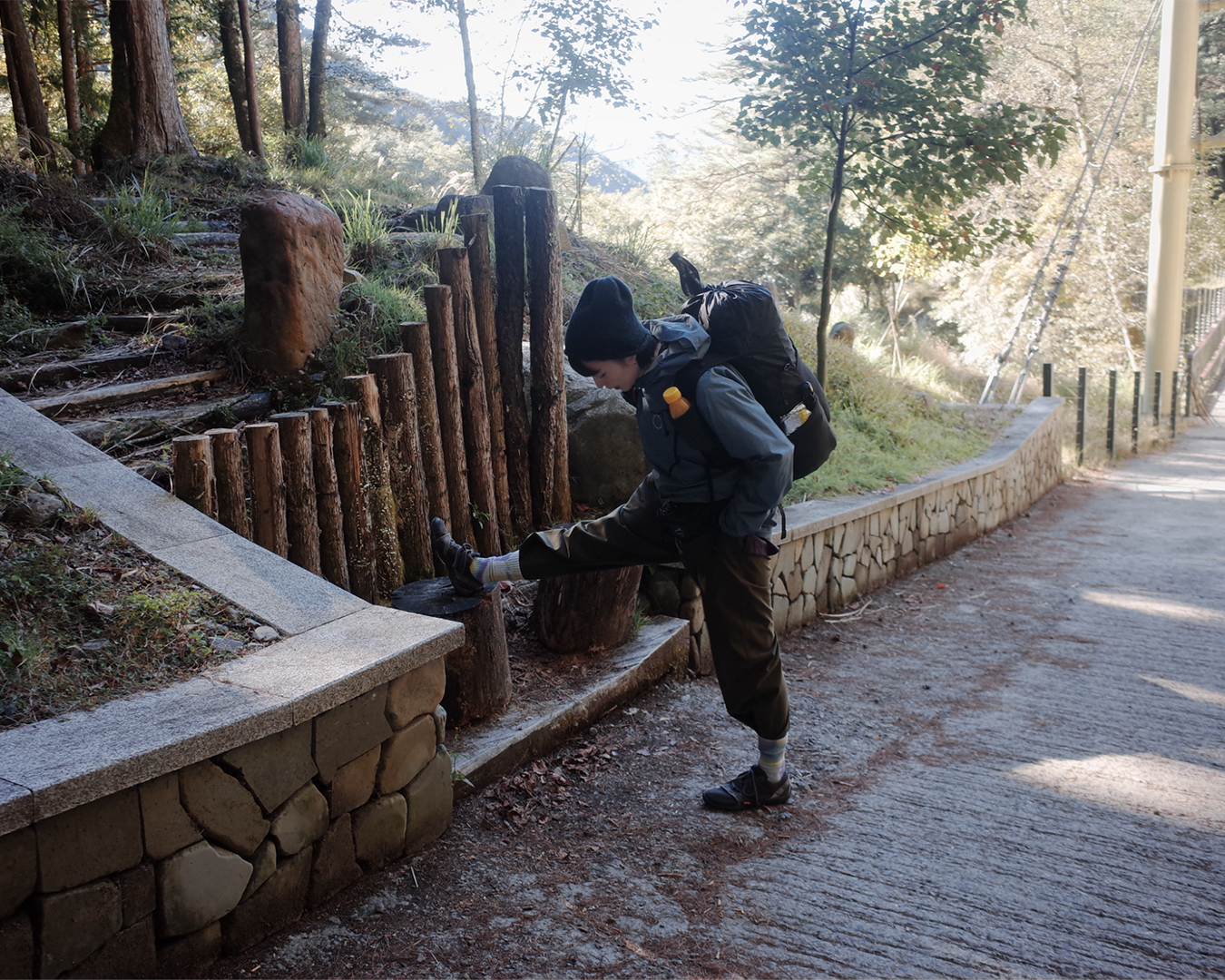 私はいつも、周囲の地形や環境を活かしながら、こまめに身体を伸ばすようにしています。脚まわりを軽くほぐす簡単なセルフマッサージも、そのひとつ。登り始める前のウォームアップとして取り入れることで、早朝のぼんやりした感覚から少しずつ離れ、身体を山に向けて整えていきます。