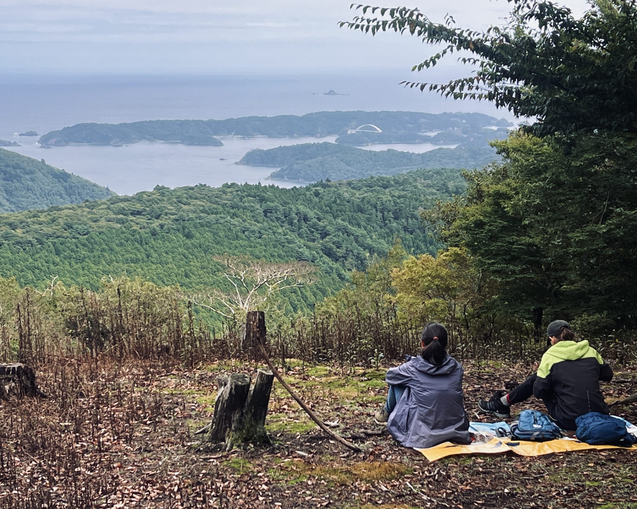 山頂からリアス海岸を眺めるハイカー(女川町・石投山)