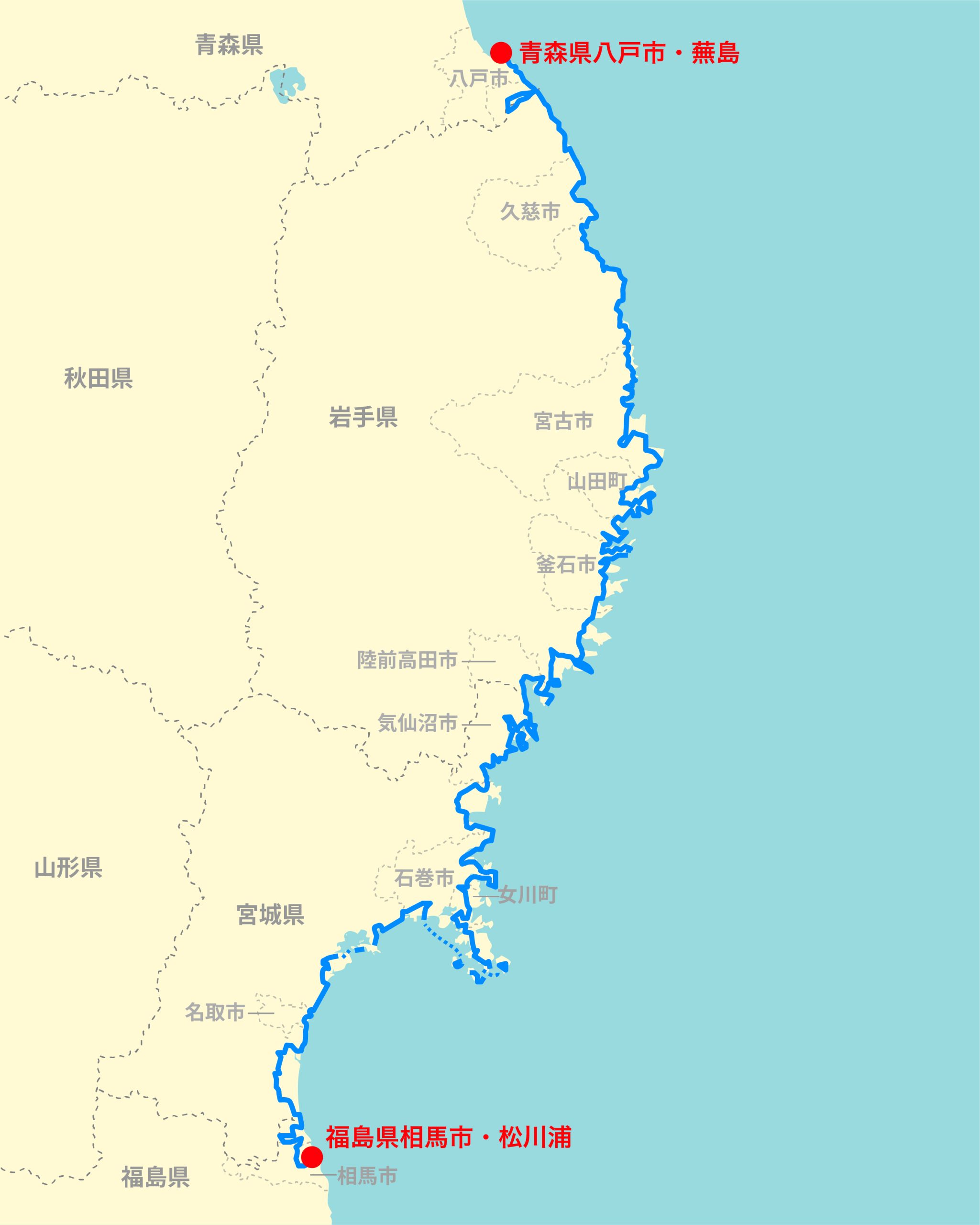 北端の青森県八戸市蕪島から南端の福島県相馬市松川浦までの沿岸地域に伸びる、青森、岩手、宮城、福島の4県29市町村を結ぶロングトレイル。