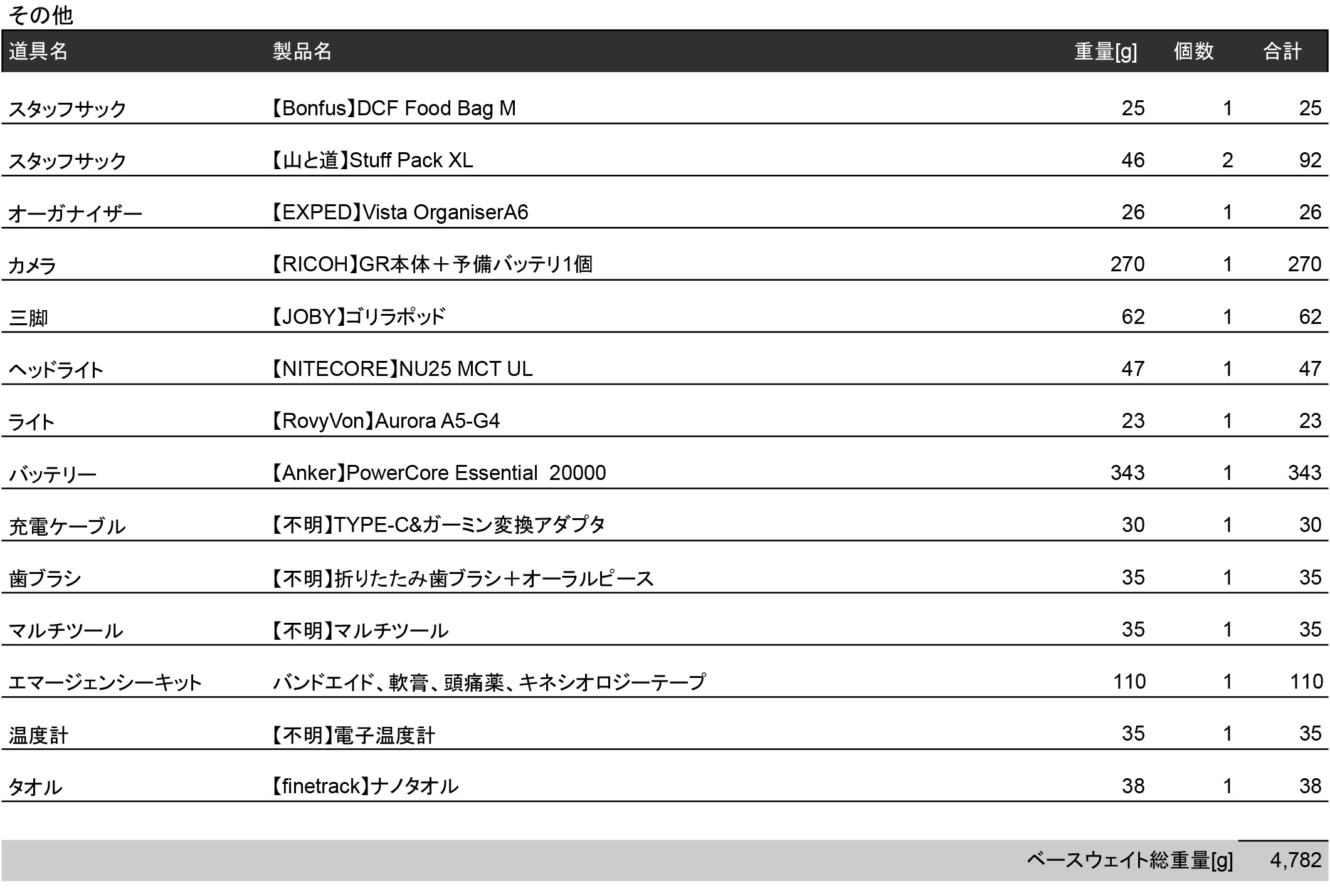 ベースウェイトで4.8kg弱、パックウェイトでは9.5kg程度となったが、334g分の贅沢品「生命の水(ウイスキー)」とアクリル製のグラスを持参。